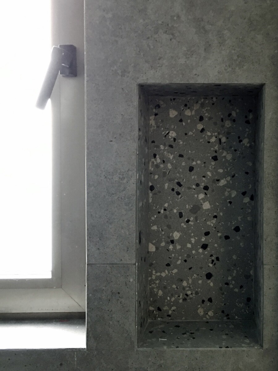 “Οι επενδύσεις έγιναν σε αποχρώσεις σκυροδέματος με διακοπές για λειτουργικά ράφια από πλάκες μωσαϊκού”.