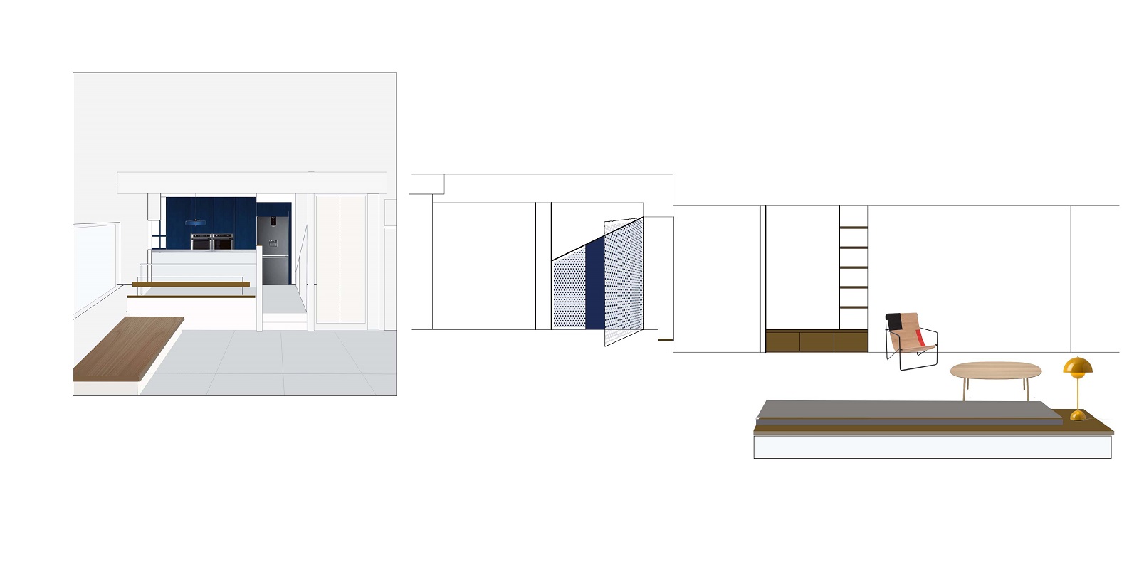 Σύμφωνα με το αρχικό σχέδιο ο χώρος διημέρευσης αναπτύσσεται κλιμακωτά από την υπαίθρια βεράντα προς τη κουζίνα σε έναν ενιαίο επιμήκη χώρο. Η γραμμικότητα του χώρου σε συνδυασμό με τα επίπεδα που ορίζουν τις λειτουργίες οδήγησε στην απόφαση για την κατασκευή ευθύγραμμων πλευρικών καθιστικών κατά μήκος του χώρου.