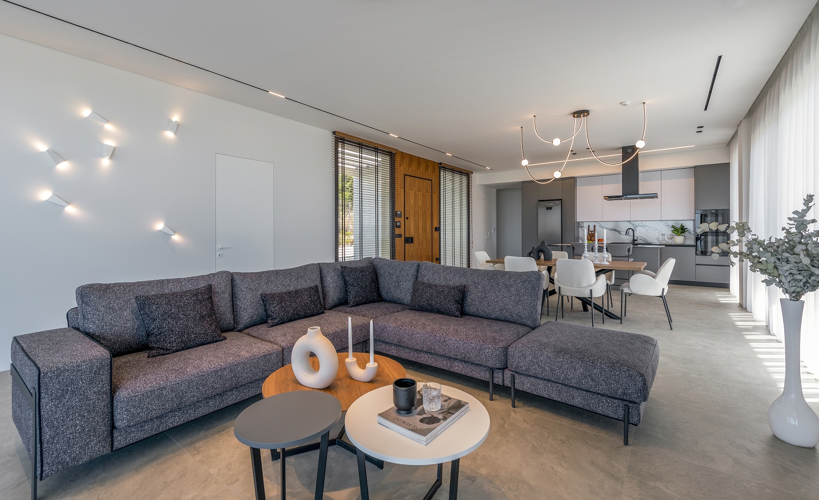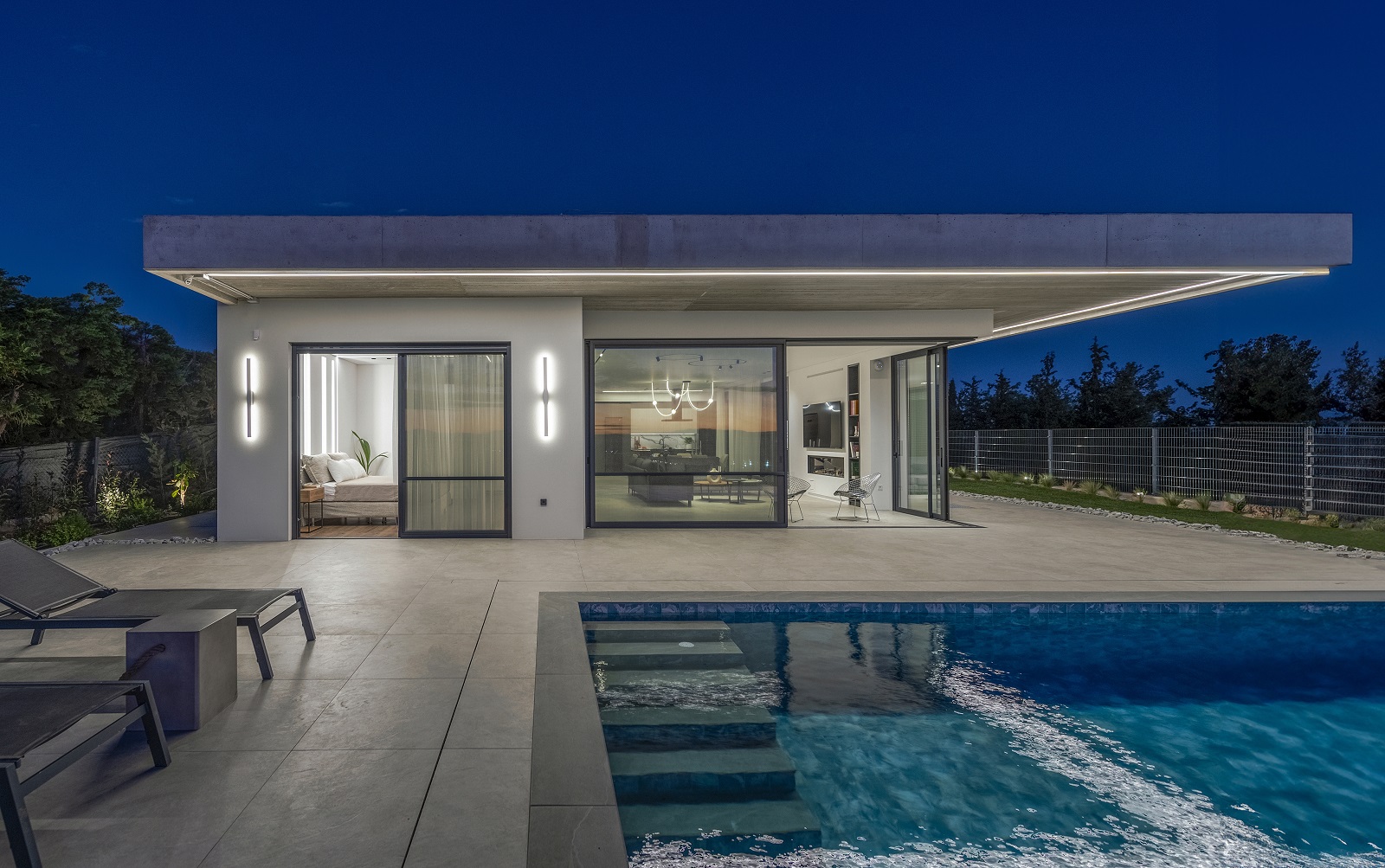 Οι κοινόχρηστοι χώροι έχουν οπτική και λειτουργική συνέχεια με τον περιβάλλοντα χώρο και την πισίνα, ενώ ο περιμετρικός πρόβολος δημιουργεί στεγασμένους χώρους που προσφέρουν προστασία ανάλογα με τις καιρικές συνθήκες και τον ηλιασμό.