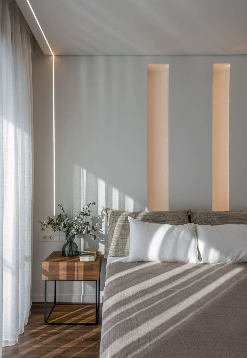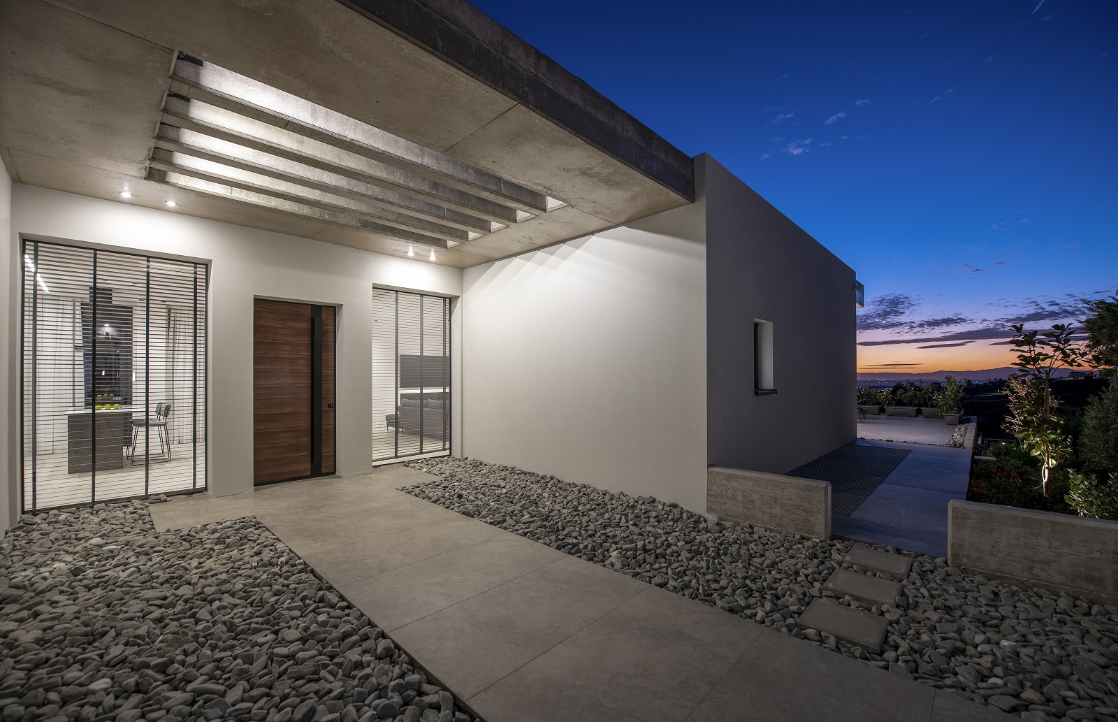 Η ζώνη των υπνοδωματίων αναπτύσσεται κάθετα στην κυρίως κατοικία. Οι τρεις ζώνες, ζώνη διημέρευσης, ζώνη ύπνου και ξενώνας, ορίζουν τον υπαίθριο χώρο που αναπτύσσεται η πισίνα και συνδιαλέγονται με αυτόν. Η κύρια είσοδος της κατοικίας τοποθετήθηκε στην εσοχή του κτιρίου, επιτρέποντας να γίνεται η πρόσβαση σε αυτήν μέσα από έναν όμορφο κήπο με pergola που θα περιστοιχίζεται από ανθοφόρα και μυρωδικά φυτά.