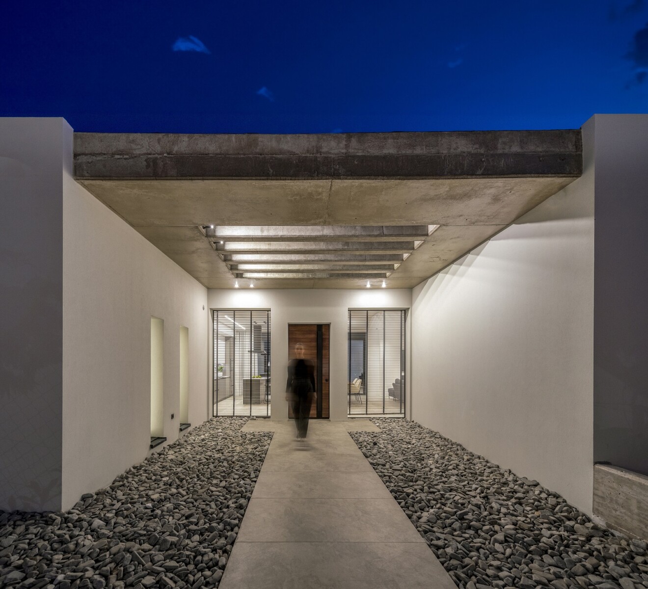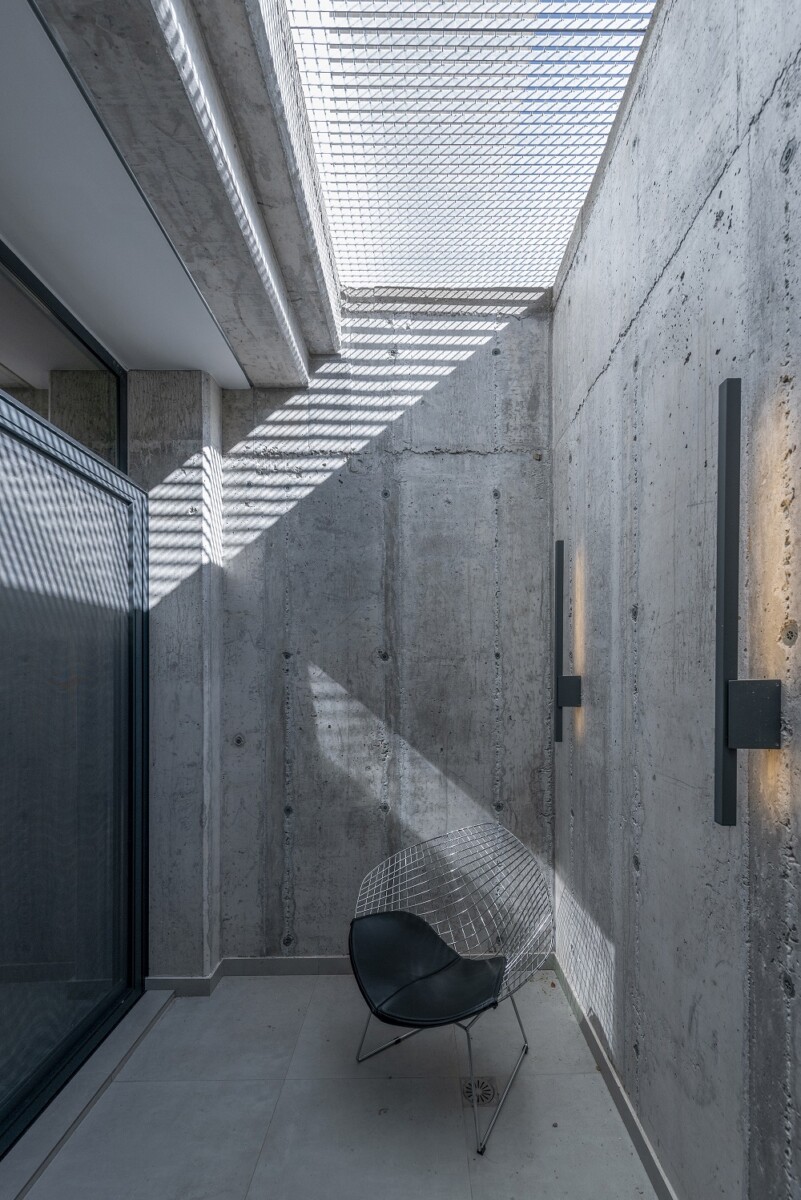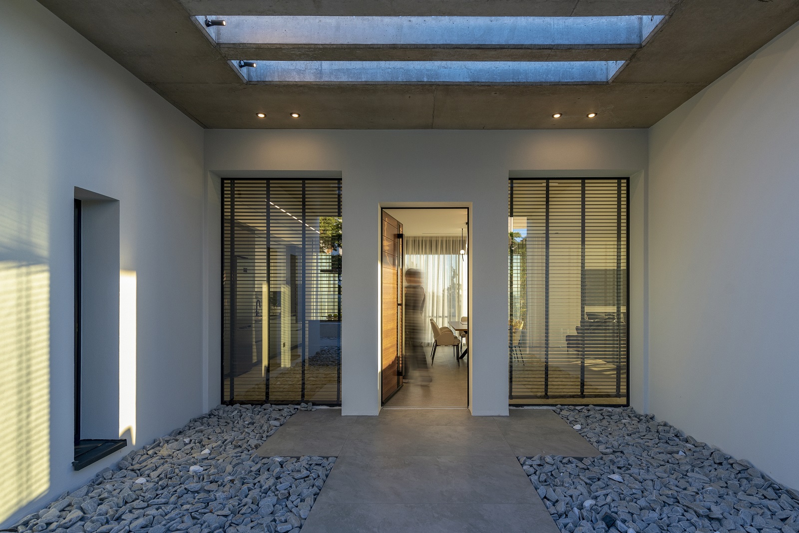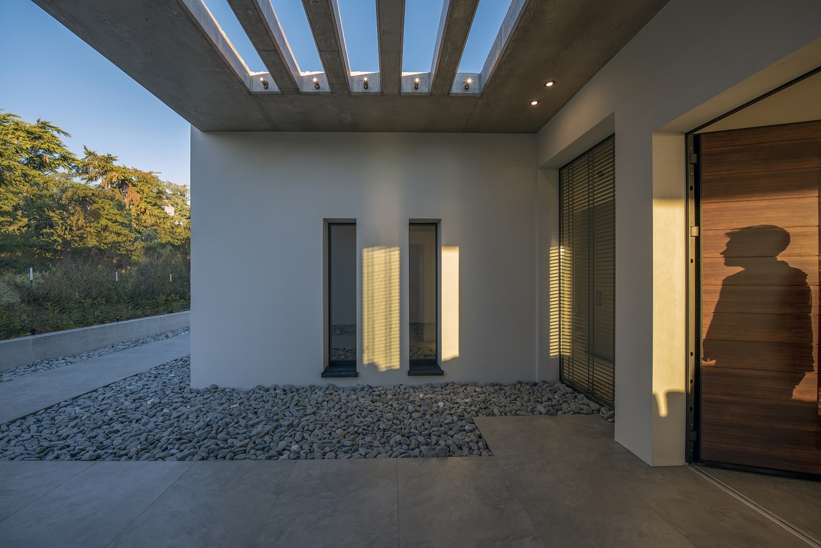 The house’s simple, modern framework is protected by a surrounding pergola-like structure made of exposed concrete. The living zone and the sleeping zone are laid out perpendicularly to each other. These constitute distinct functional and spatial volumes, connected by a corridor that runs through the house, serving as their joint.