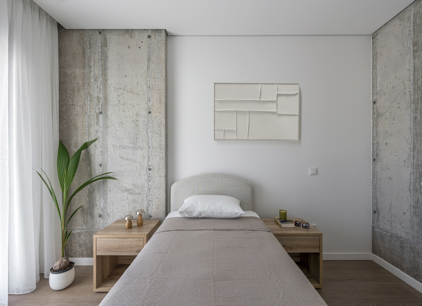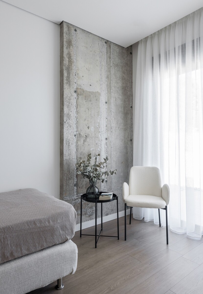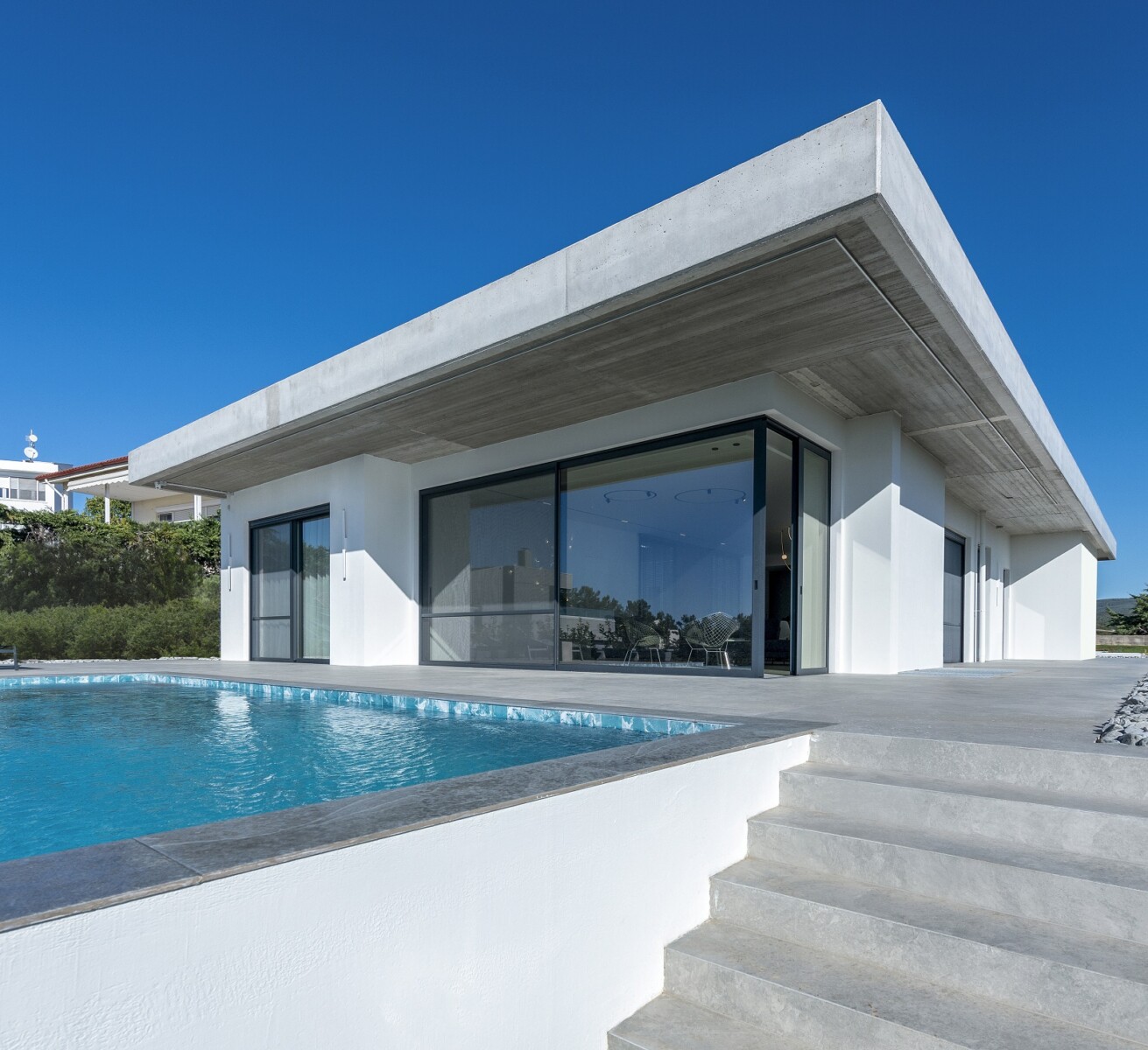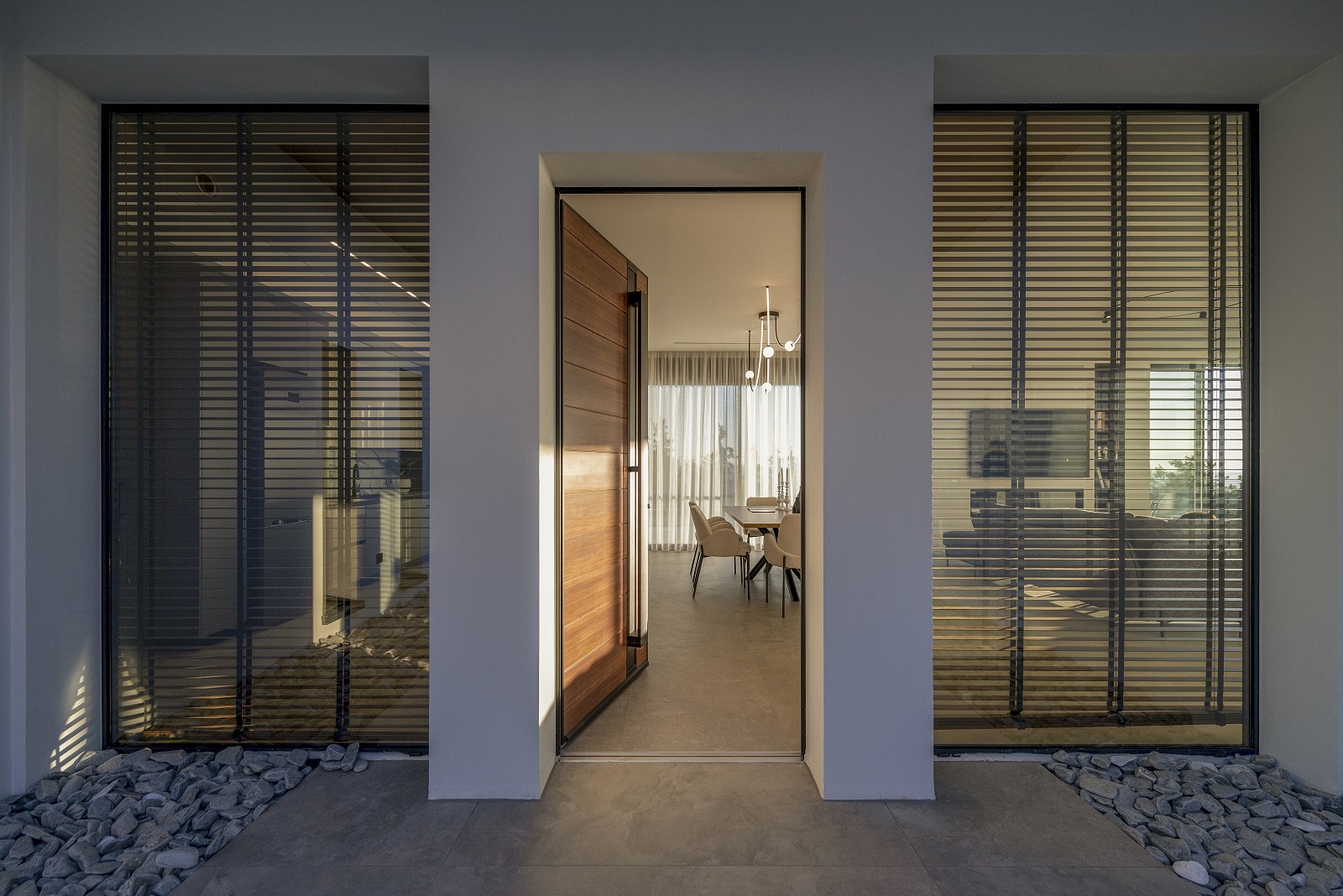 The house’s simple, modern framework is protected by a surrounding pergola-like structure made of exposed concrete. The living zone and the sleeping zone are laid out perpendicularly to each other. These constitute distinct functional and spatial volumes, connected by a corridor that runs through the house, serving as their joint.