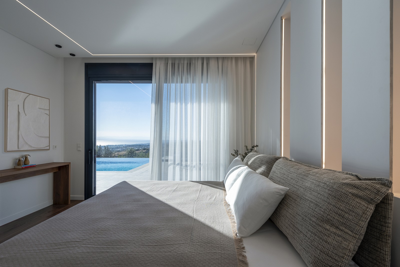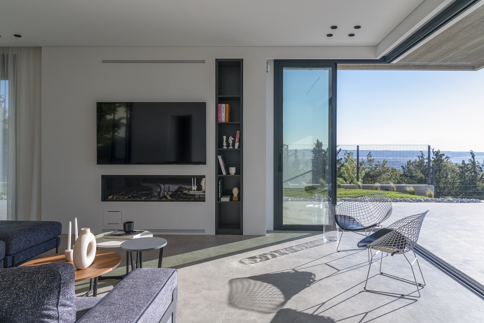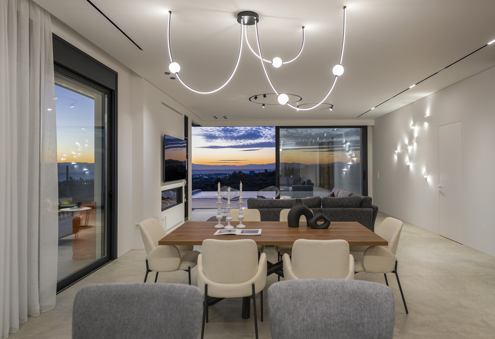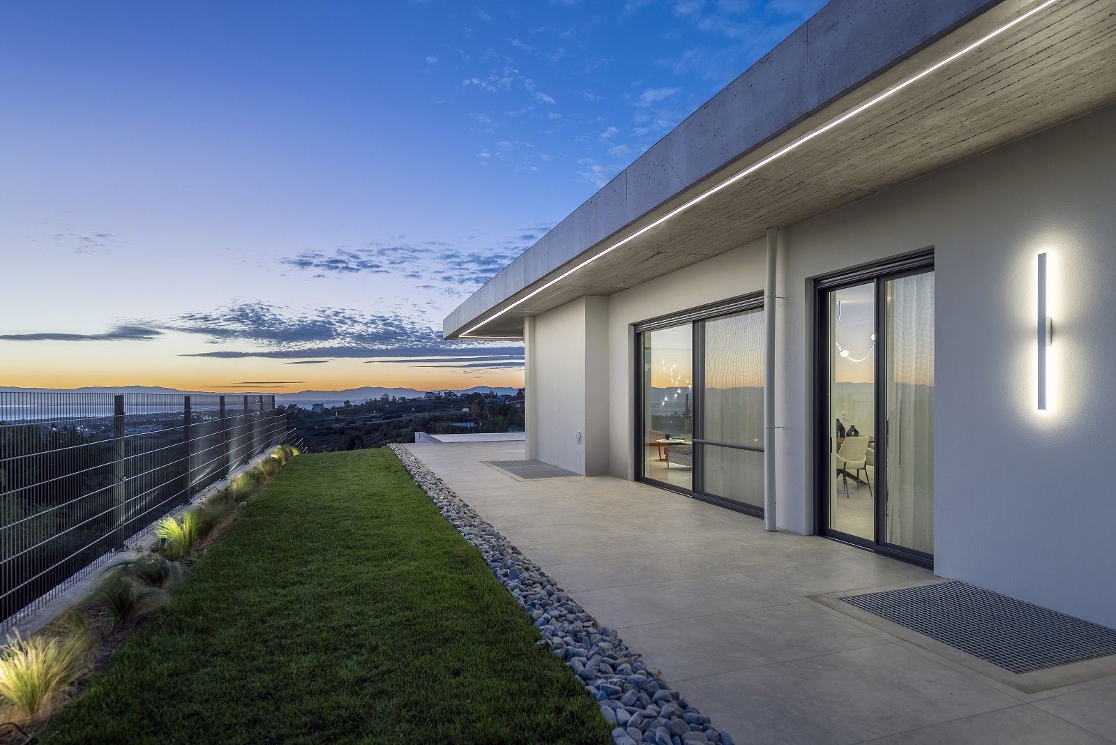 The design of the building, by Skarlakidis Architecture Studio, takes advantage of the natural terrain and the orientation of the plot. The view toward the Thermaic Gulf and the city of Thessaloniki, the proximity to a forested area, the linear shape of the plot, as well as the adjacency to a busy urban road, all led to a composition that extends outward toward the view and creates a strong zoning layout culminating in the outdoor area — the terrace with the pool — where private life unfolds, shielded from neighboring buildings.