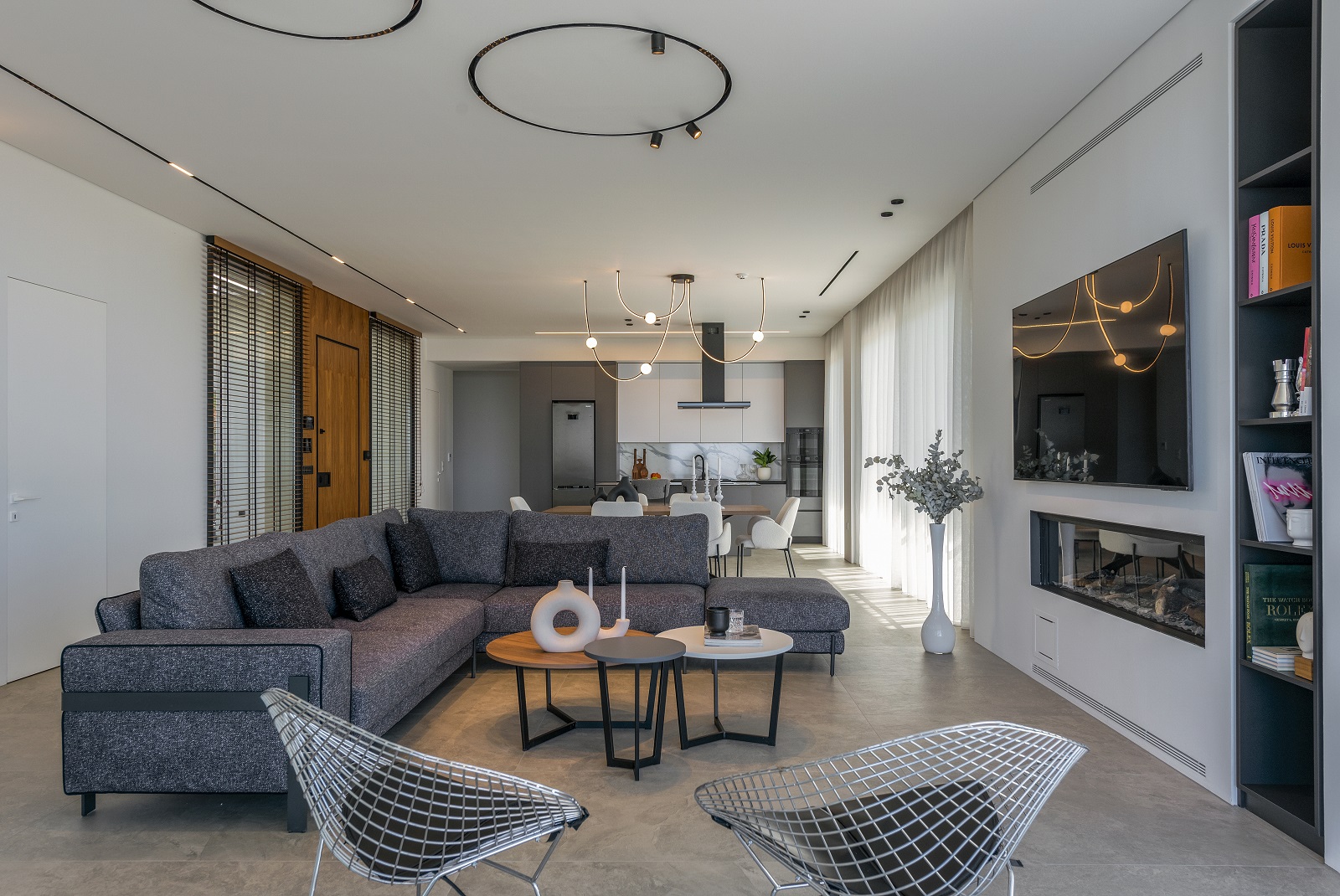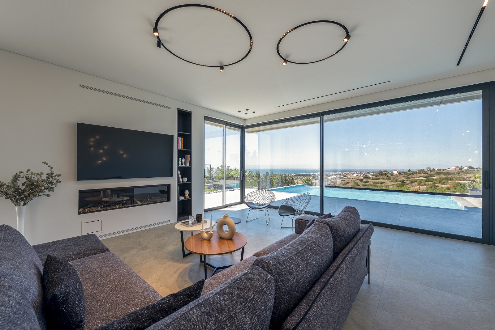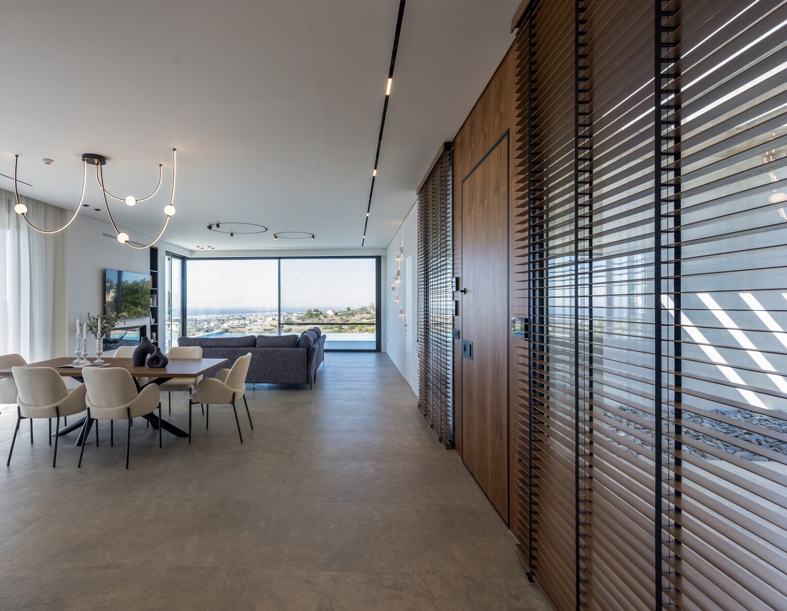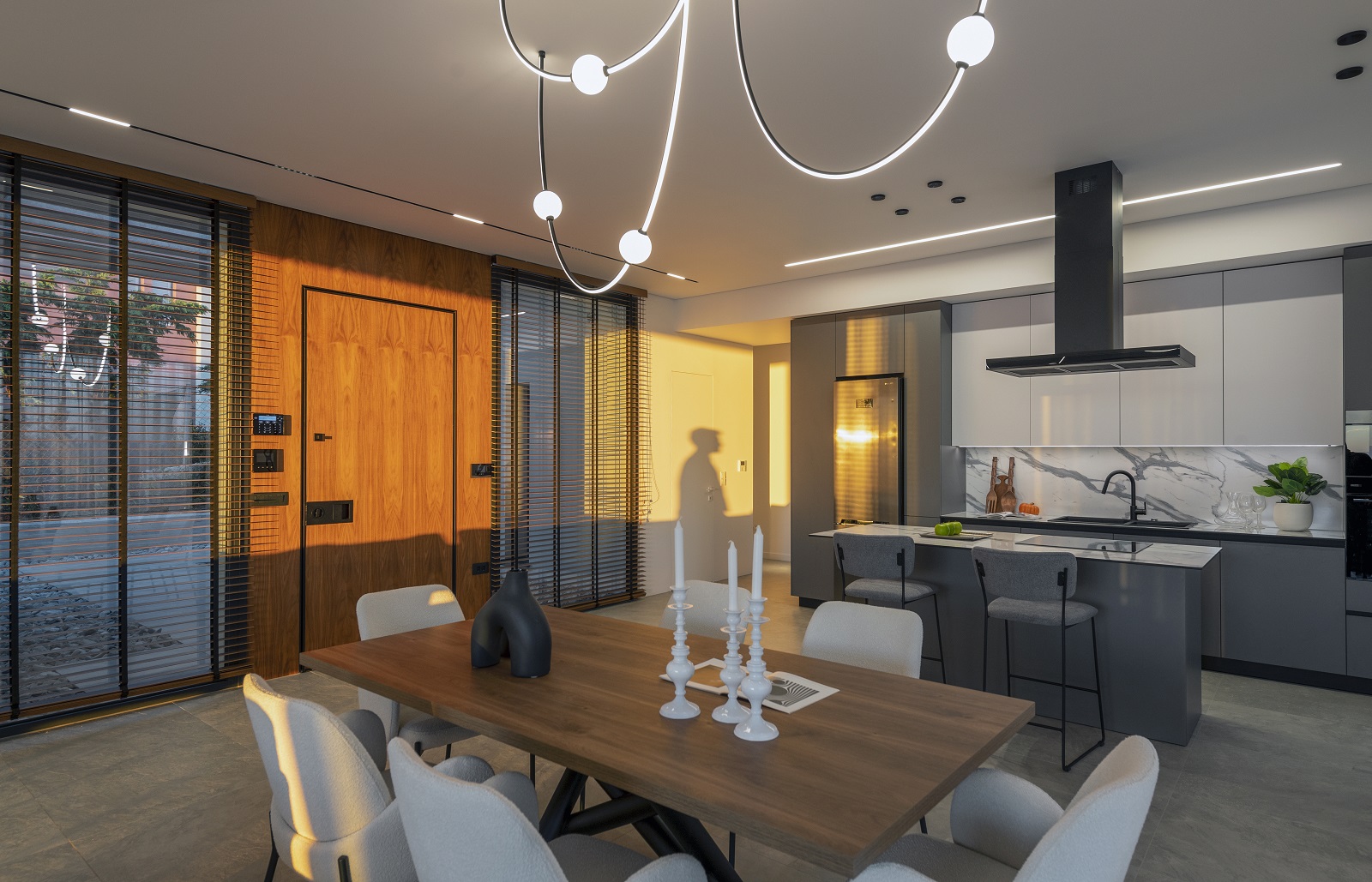 The design of the building, by Skarlakidis Architecture Studio, takes advantage of the natural terrain and the orientation of the plot. The view toward the Thermaic Gulf and the city of Thessaloniki, the proximity to a forested area, the linear shape of the plot, as well as the adjacency to a busy urban road, all led to a composition that extends outward toward the view and creates a strong zoning layout culminating in the outdoor area — the terrace with the pool — where private life unfolds, shielded from neighboring buildings.