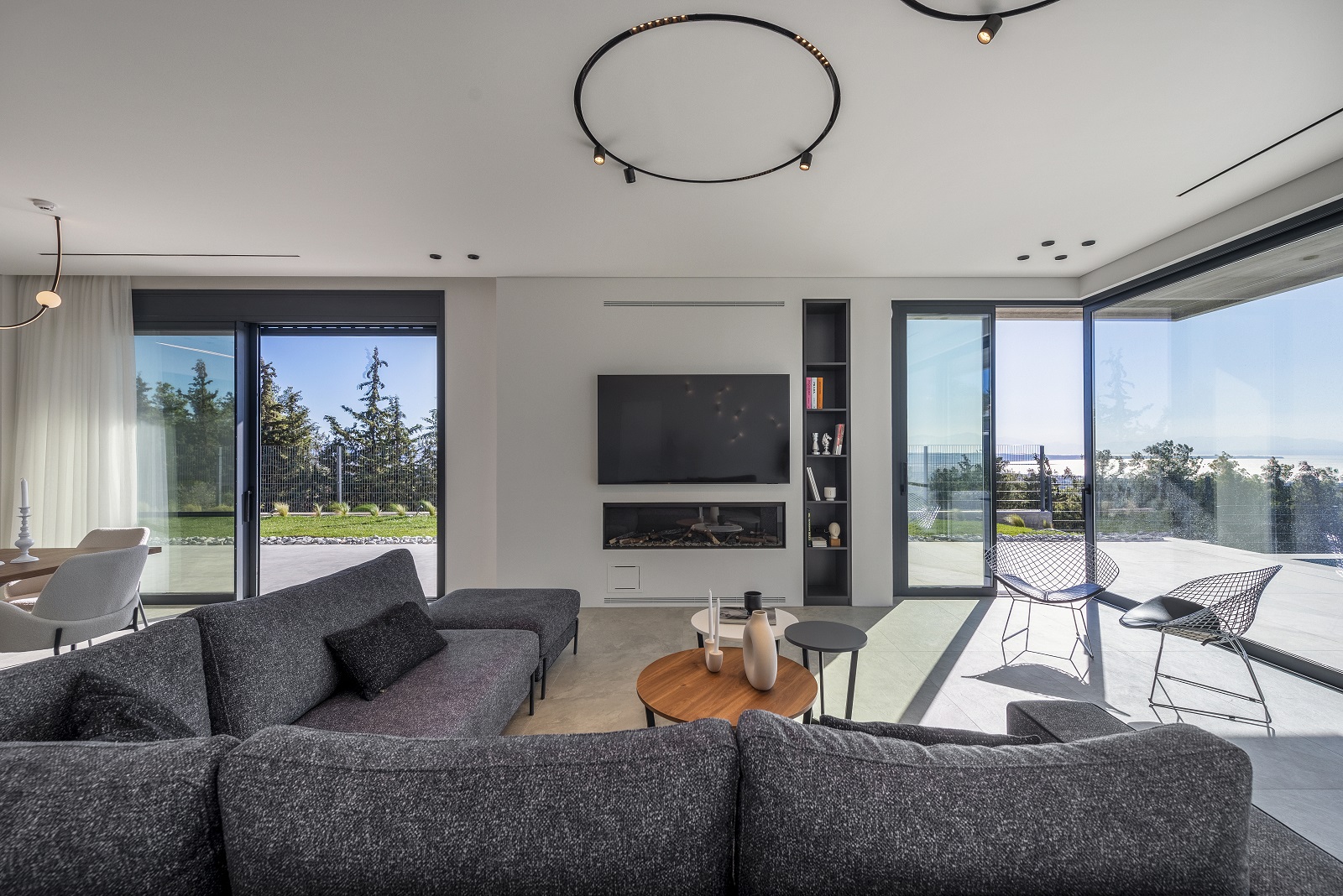 Vehicles enter from the northeastern corner of the plot and, moving along a ramp adjacent to the neighboring property, are led to the outdoor parking area, thus ensuring direct access to the residence. The view, the forest, and the integration of the residence into the landscape were the primary factors that shaped the design and form of the building, which is presented as a framework of privacy from external factors.