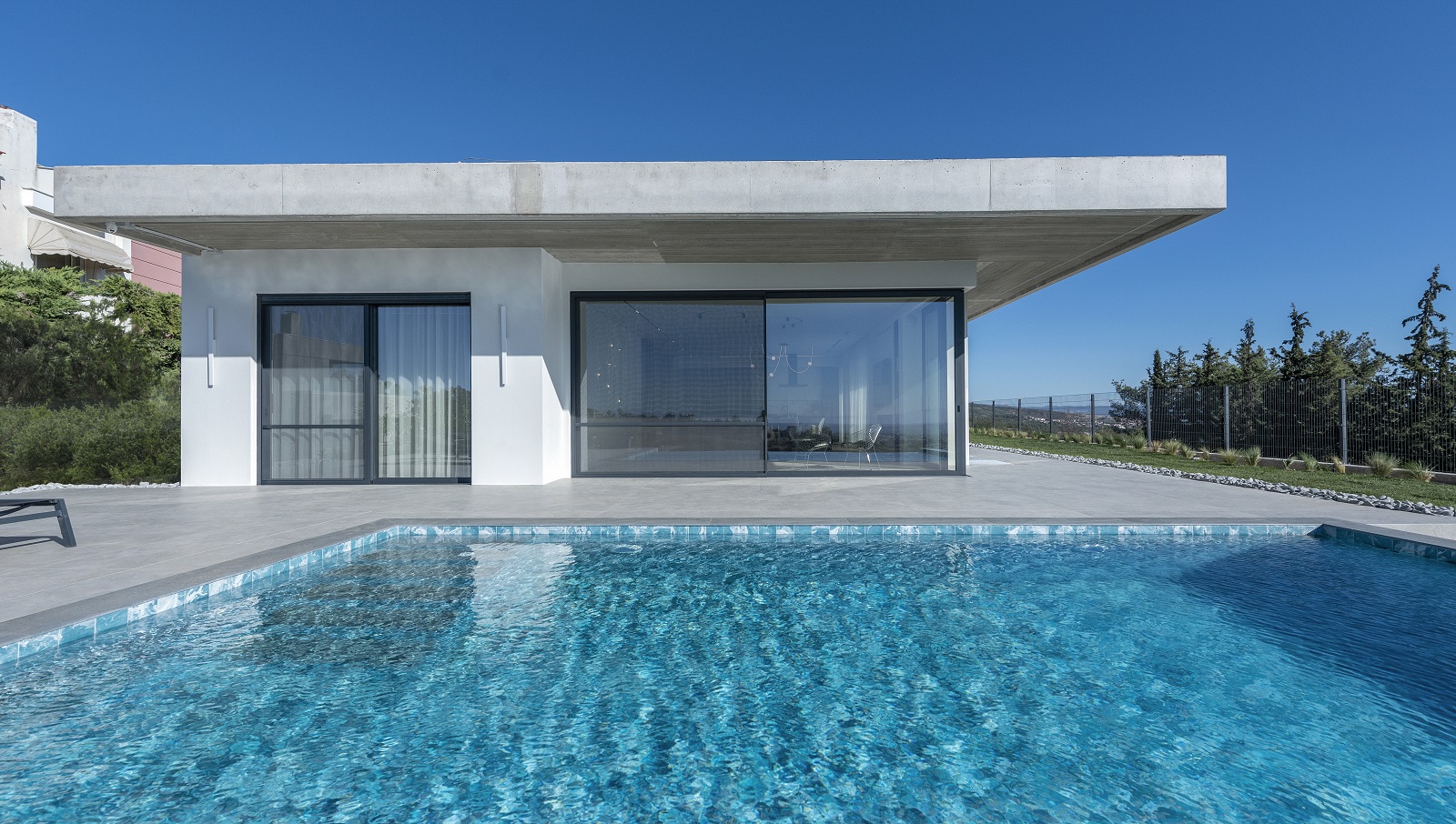 English description: The single-family house is located in Panorama, Thessaloniki, at a spot offering an amphitheatrical view of the Thermaic Gulf and the city. The owners’ wish was to build a ground-level residence with a swimming pool, maximizing the view toward the sea and the forest. With this in mind, the main family residence was designed.