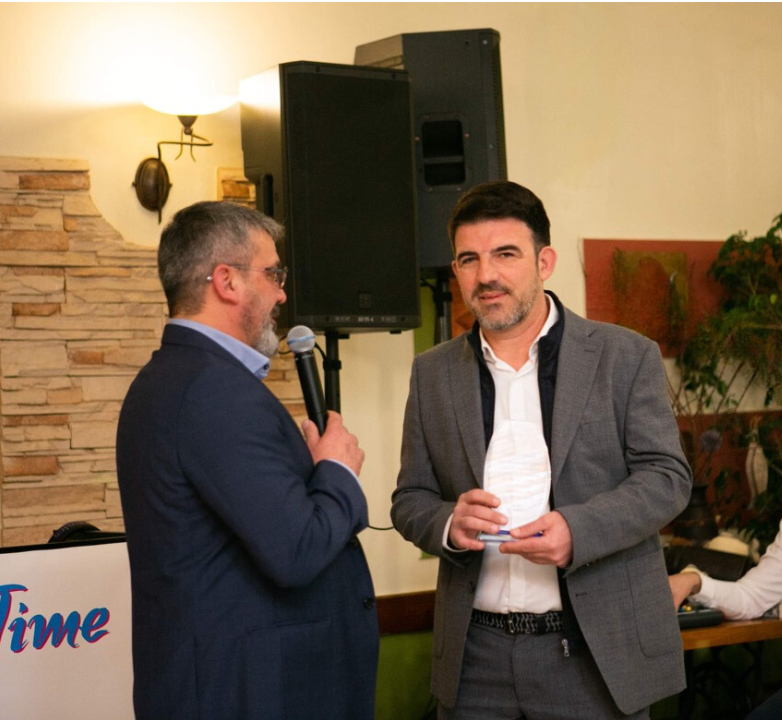 Οι οικοδεσπότες της βραδιάς, ο Πρόεδρος, κ. Δημήτρης Εμμανουηλίδης και το Διοικητικό Συμβούλιο του Σωματείου Επαγγελματιών τίμησαν τους ιδρυτές της OLYMPIAELECTRONICSS.A., κ. Παναγιώτη Αρβανιτίδη και κ. Νικόλαο Λακασά για την μακροχρόνια ανοδική πορεία της εταιρείας και για την πολύτιμη κοινωνική και οικονομική συνεισφορά της στην Βόρεια Πιερία.