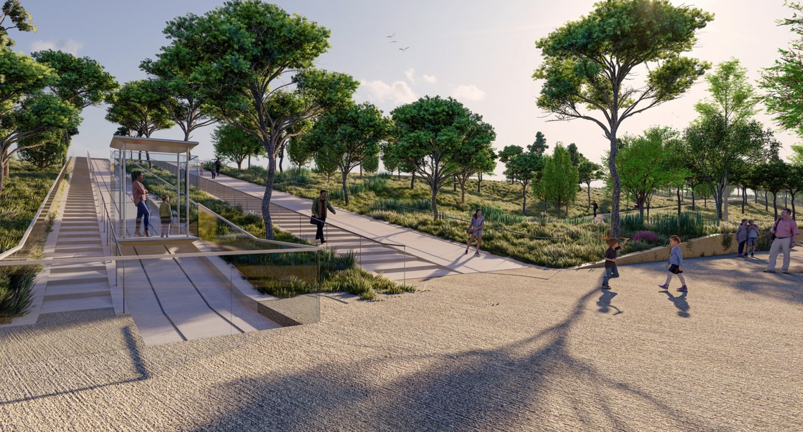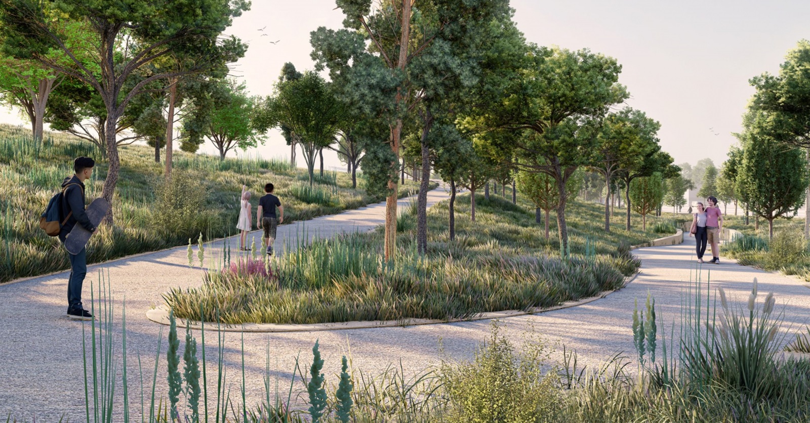 Τα γραμμικά κτίρια που σήμερα στεγάζουν υπηρεσίες θα διαμορφωθούν στην οροφή και θα φυτευτούν 4.000 νέα δέντρα και 210 χιλ. φυτά. Συνολικά προβλέπονται 250 στρέμματα νέων χώρων πρασίνου ώστε το πάρκο, το οποίο ακολουθεί τη φιλοσοφία του νέου ευρωπαϊκού Bauhaus να είναι πράσινο σε ποσοστό 73% τουλάχιστον.