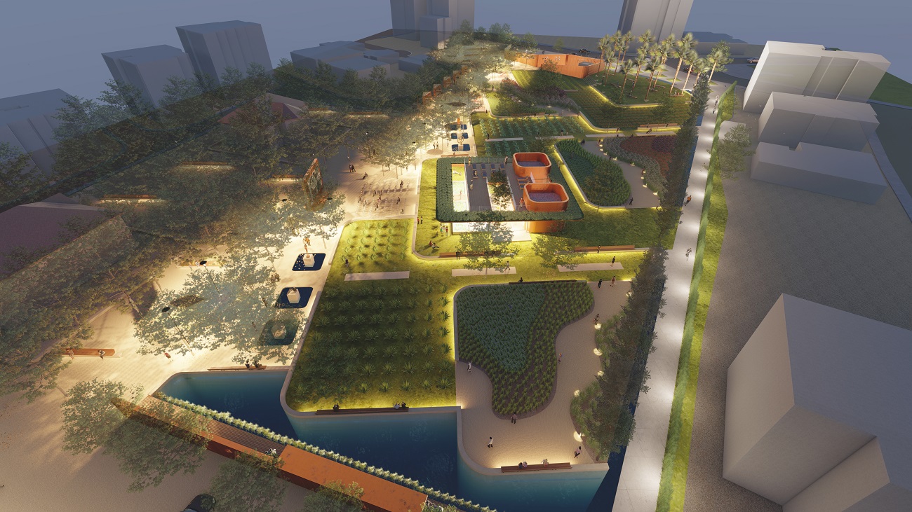 Το νερό, το στοιχείο που έπαιζε στο παρελθόν ζωογόνο ρόλο στην λειτουργία του κυβερνητικού φυτωρίου, επανέρχεται δυναμικά ως ένα «ρυάκι» με λίμνες στις δύο άκρες του, το οποίο διατρέχει και πλαισιώνει τη σύνθεση και λειτουργεί ως ένα στοιχείο δροσιάς, μικροκλίματος αλλά και ηχητικής απόλαυσης, που με το κελάρυσμά του διασκεδάζει τους θορύβους της πολύβουης πόλης. Δίπλα στο “ρυάκι”, η υφιστάμενη ανατολική συνοριακή διέλευση διατηρείται, απομονώνεται με πράσινο από τις γειτονικές κατοικίες και εξωραΐζεται ως ένα δροσερό «πλευρικό μονοπάτι», που επεκτείνεται προς την νοτιοδυτική πρόσβαση του τεμαχίου, επιτυγχάνοντας έτσι μια διαμπερή διέλευση πεζών, που ενοποιεί τον άμεσα γειτονικό αστικό ιστό με τις δημόσιες λειτουργίες της πόλης.