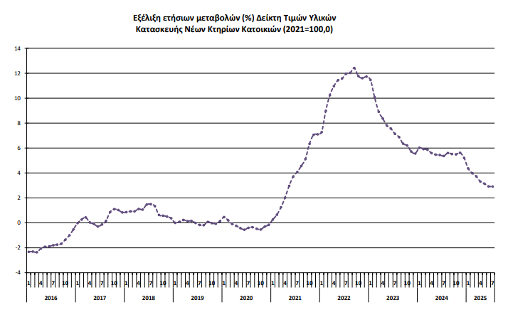 Η ΕΛΣΤΑΤ ανακοίνωσε ότι ο Γενικός Δείκτης Τιμών Υλικών Κατασκευής Νέων Κτηρίων Κατοικιών τον Ιούλιο 2025 κατέγραψε άνοδο 2,9% σε σχέση με τον Ιούλιο 2024, όταν η αύξηση είχε διαμορφωθεί στο 5,4% έναντι του 2023. Σύμφωνα με την ανάλυση, ο σημαντικότερος παράγοντας ήταν η ηλεκτρική ενέργεια, με τις τιμές της να εμφανίζουν άνοδο 18,9% μέσα σε έναν χρόνο.