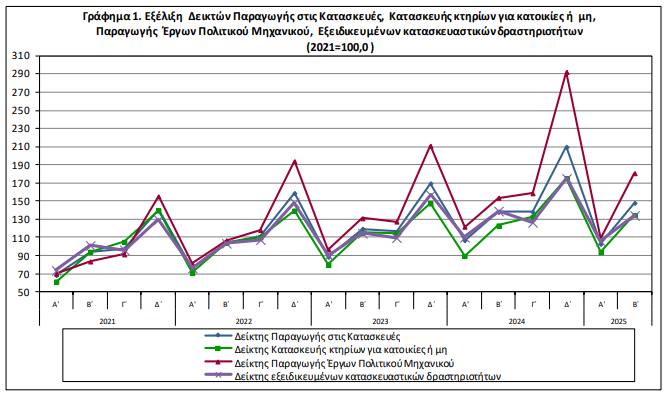 Ο Δείκτης Παραγωγής στις Κατασκευές του Β’ τριμήνου 2025, σε σύγκριση με τον αντίστοιχο δείκτη του Α’ τριμήνου 2025, παρουσίασε αύξηση 44,0% έναντι αύξησης 29,3% που σημειώθηκε κατά την αντίστοιχη σύγκριση του Β’ τριμήνου 2024 με το Α’ τρίμηνο 2024.