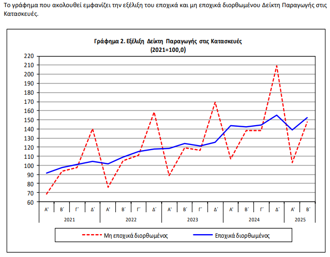 Ο εποχικά διορθωμένος Δείκτης Παραγωγής στις Κατασκευές του Β’ τριμήνου 2025, σε σύγκριση με τον αντίστοιχο δείκτη του Α’ τριμήνου 2025, παρουσίασεαύξηση 9,8%.