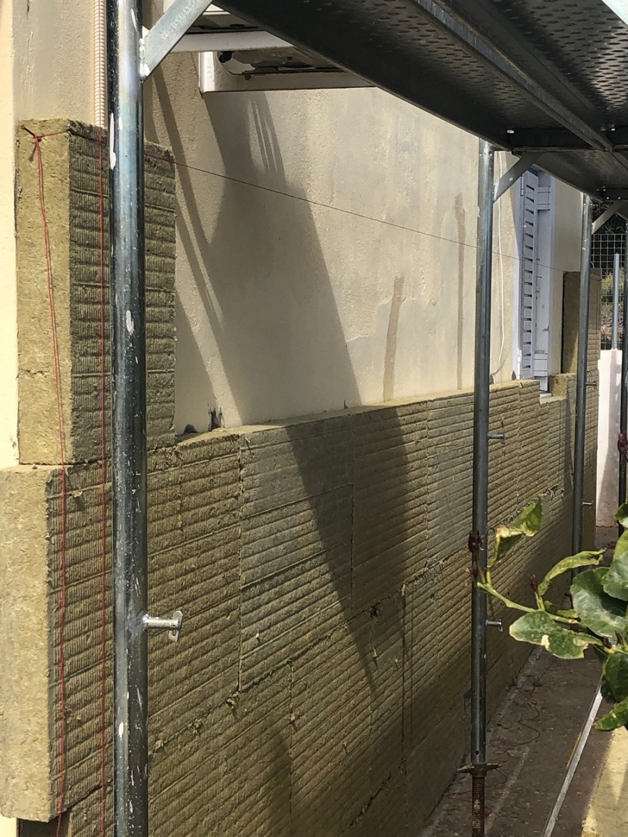 Με βάση τα προαναφερθέντα, για την ενεργειακή αναβάθμιση της τοιχοποιίας, προκρίθηκε εφαρμογή πετροβάμβακα FKD–S Thermal πάχους 100mm , στα πλαίσια του ολοκληρωμένου συστήματος Knauf Thermoprosopsis MW Thermal.