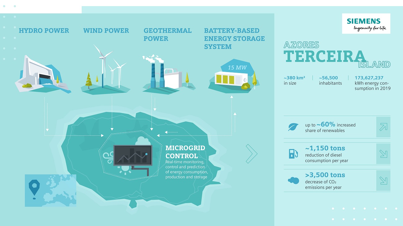 Η Smart Infrastructure της Siemens, σε συνεργασία με τη Fluence, αναδείχθηκε ανάδοχος από τον πορτογαλικό πάροχο ενέργειας, EDA – Electricidade dos Açores, για την κατασκευή ενός συστήματος αποθήκευσης ενέργειας με χρήση μπαταριών στο Terceira, το δεύτερο μεγαλύτερο νησί σε ηλεκτρική κατανάλωση στο αρχιπέλαγος των Αζορών στον Ατλαντικό. Το έργο στοχεύει να καταστήσει το νησί πιο βιώσιμο και η ολοκλήρωσή του έχει προγραμματιστεί για το 2021.