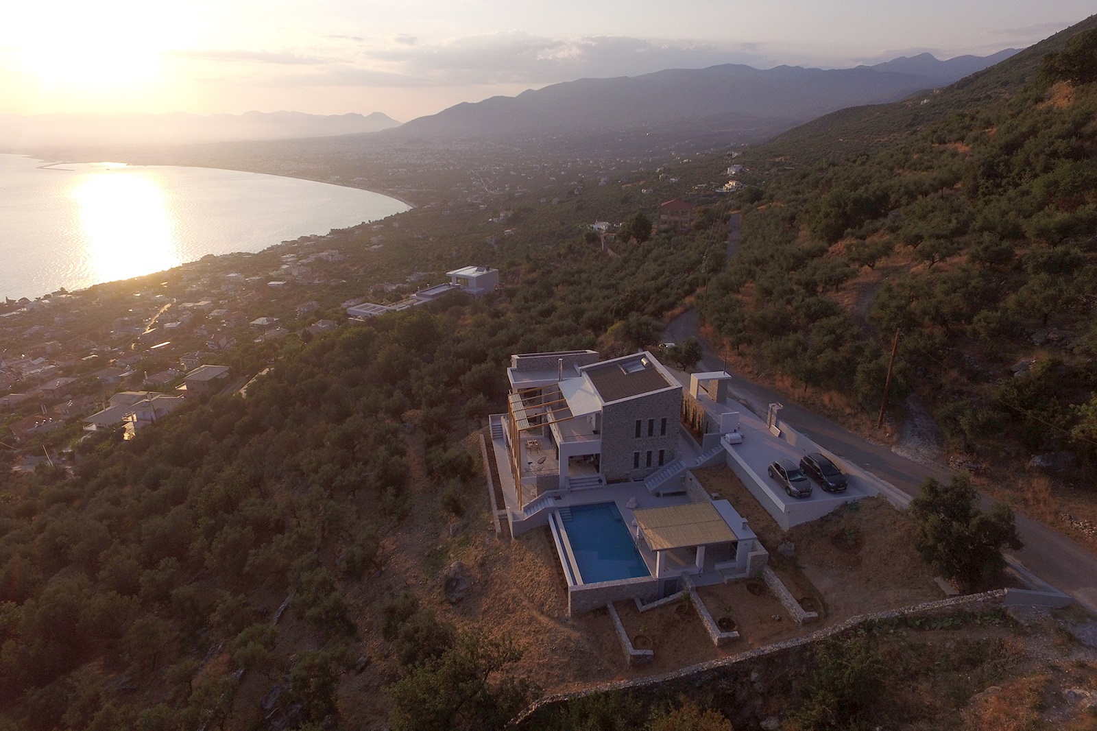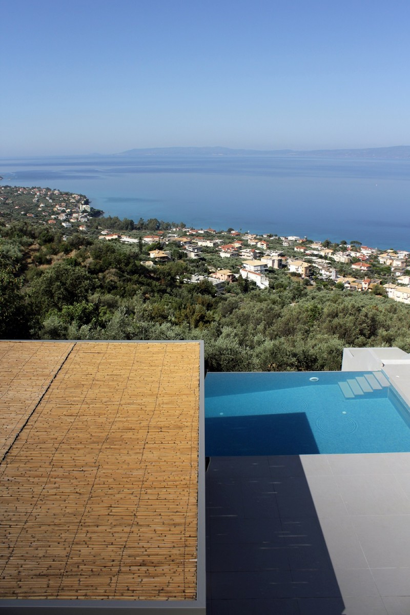 The house is built near Verga, the closest settlement to Kalamata in the Messinian Mani. What primarily characterizes the location of the house is the natural landscape, with the olive groves, the spectacular view of the Messinian Gulf and the steep, sloping terrain. The integration of the house into the landscape and its direct relationship with the natural environment are main concerns of the design.