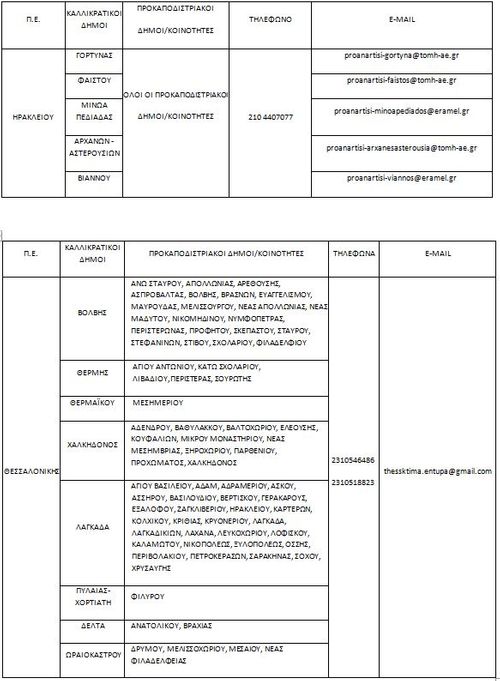 Ακολουθεί λεπτομερής πίνακας με τις περιοχές και τα στοιχεία επικοινωνίας: