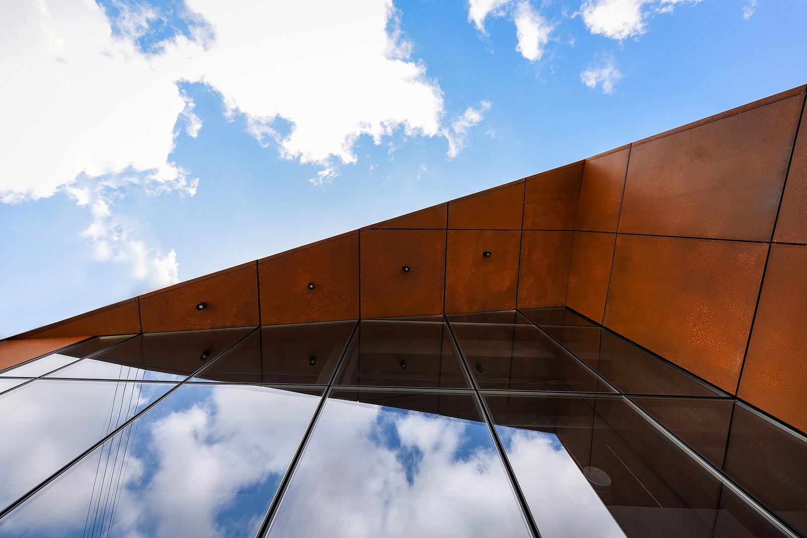 Από την ανατολική κατεύθυνση και σε αντίθεση με τον συμπαγή όγκο οξειδωμένου χάλυβα, η διώροφη επιφάνεια γυαλιού του υαλοστασίου παρουσιάζει με την διαπερατότητα της, τα εσωτερικά δρώμενα στο δημόσιο και αντίθετα.