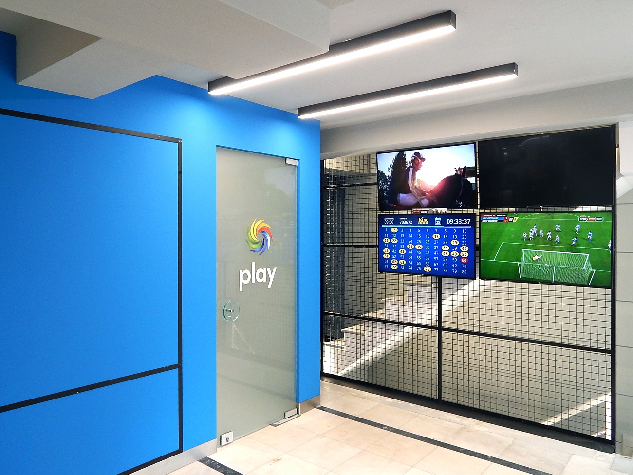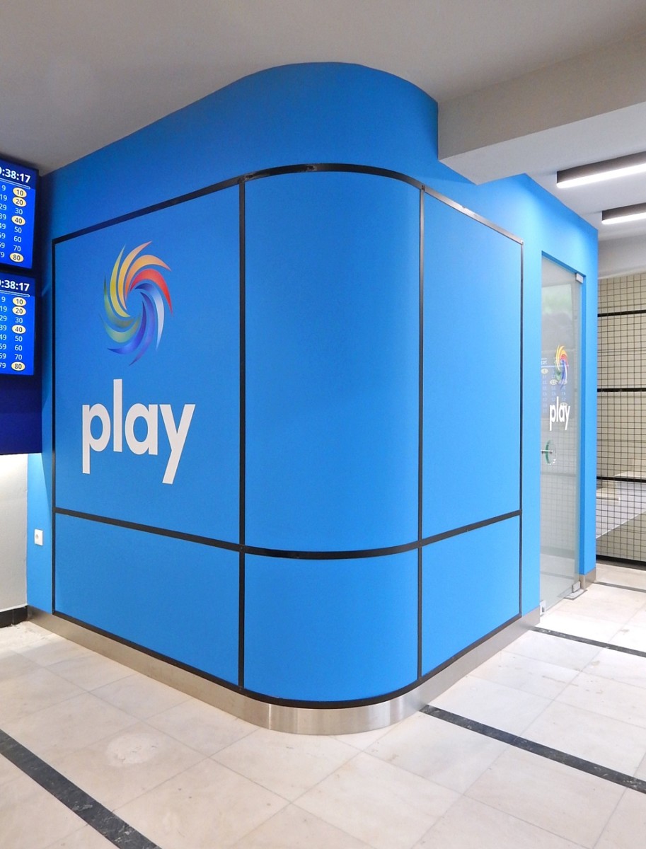 → Ο χώρος του Play χαρακτηρίζεται από το γαλάζιου χρώματος όγκο και τοποθετήθηκε με σκοπό να δημιουργηθεί ένα οπτικό ερέθισμα στο πίσω μέρος του καταστήματος αλλά και να ορίσει τις κινήσεις προς το πατάρι όπου μελλοντικά προβλέπεται η κατασκευή ενός πιο ιδιωτικού lounge για παρακολούθηση αγώνων και προς το υπόγειο (η σκάλα βρίσκεται πίσω από το μεταλλικό πλέγμα) όπου υπάρχουν βοηθητικές λειτουργίες αποθήκευσης και εξυπηρέτησης κοινού και προσωπικού (wc, κουζινάκι, αποδυτήρια κλπ). Στο υπόγειο αναδείχθηκε το παλιό θησαυροφυλάκιο της τράπεζας ως θεματικό αντικείμενο για εγκαταστάσεις που σχετίζονται με διαφορετικές περιόδους του χρόνου.