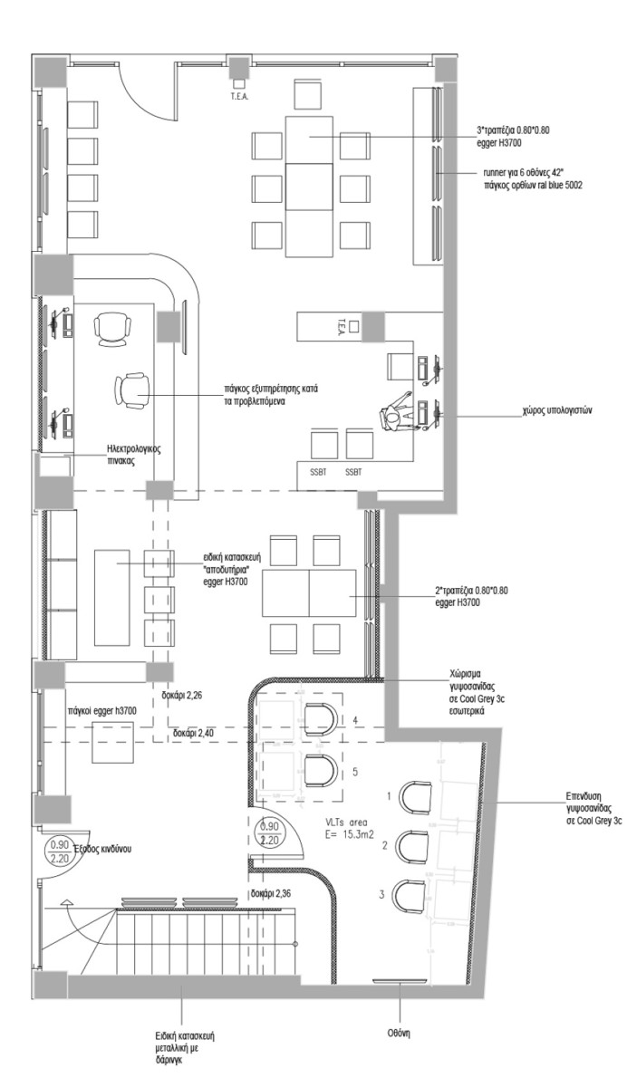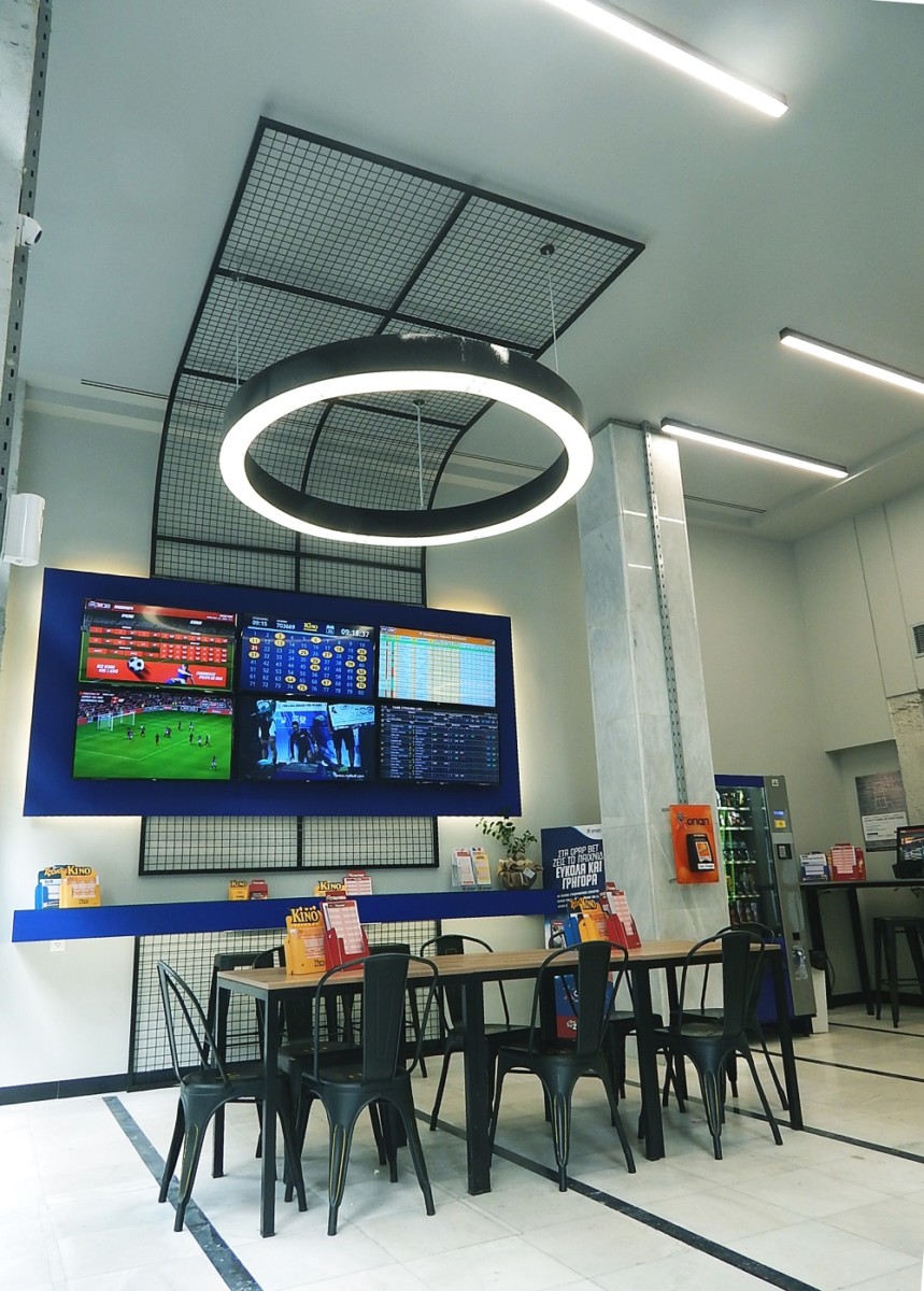 → Η fast lane που βρίσκεται σε άμεση επαφή με την είσοδο όπου και εξυπηρετούνται πελάτες που επιθυμούν να παίξουν γρήγορα. Τα έπιπλα κατασκευάστηκαν από μεταλλικό σκελετό και μελαμίνη από τον κατάλογο του ΟΠΑΠ ενώ χρησιμοποιήθηκαν μεταλλικά καθίσματα με κίτρινες λεπτομέρειες. Τα runner των οθονών, οι οθόνες και ο ηλεκτρομηχανολογικός εξοπλισμός ακολουθούν τις προδιαγραφές του ΟΠΑΠ για άνετη θέαση και στηρίζονται άλλοτε σε γυψοσανίδα και άλλες φορές σε μεταλλική κατασκευή. Για το φωτισμό του χώρου σχεδιάστηκαν δύο κυκλικά γραμμικά φωτιστικά από λαμαρίνα σε μαύρο χρώμα προσαρμοσμένα στη κλίμακα τόσο του χώρου αλλά και του παρακείμενου δρόμου έτσι ώστε να δημιουργηθούν και οπτικά ερεθίσματα στους περαστικούς που να προσκαλούν στο εσωτερικό. Ο φωτισμός συμπληρώνεται με μαύρα γραμμικά φωτιστικά χαμηλής κατανάλωσης ενέργειας και με ατμοσφαιρικό φωτισμό στα runners και στο ταμείο.