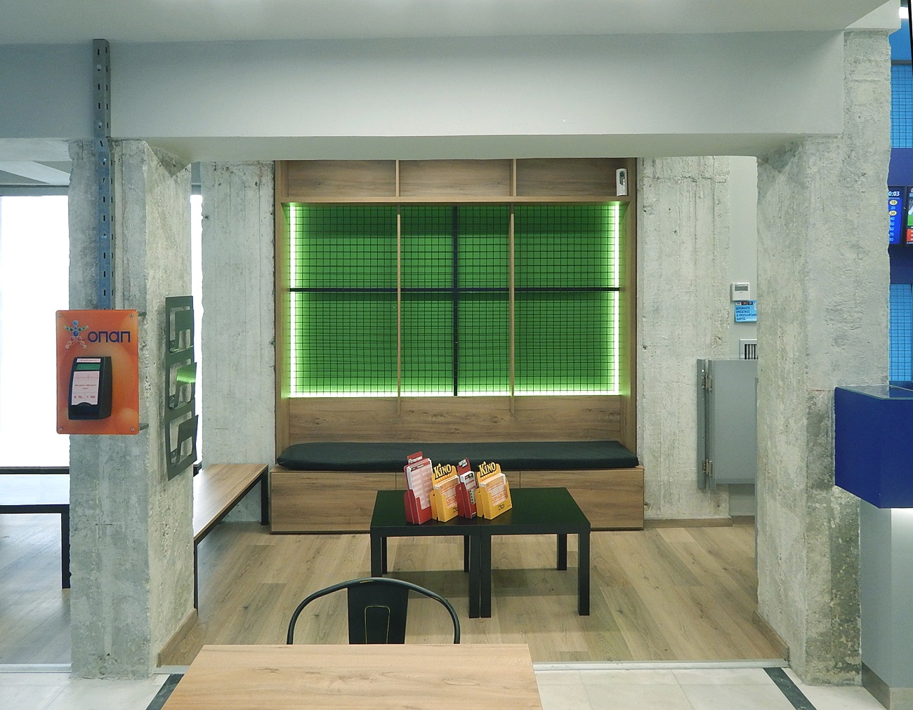 Για να είναι πιο φιλικός ο χώρος στους επισκέπτες έγινε χρήση υλικών που να παραπέμπουν στο ξύλο ενώ χρησιμοποιήθηκαν όπου επιτρεπόταν από την ταυτότητα του ΟΠΑΠ χρωματικές αποχρώσεις θερμές.