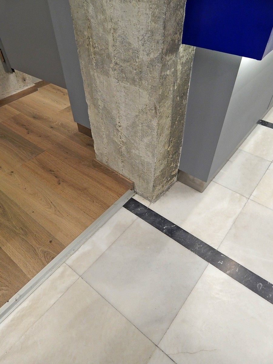 Επένδυση με μάρμαρο υπήρχε και σε επιλεγμένα στοιχεία του φέροντα οργανισμού. Παρά τα ακριβά υλικά μεταγενέστερες επεμβάσεις με ιδιαίτερα ‘διακοσμητικό” χαρακτήρα είχαν δημιουργήσει αλλοιώσεις στην εικόνα του κτιρίου και του καταστήματος ειδικότερα μέσα από την εκτεταμένη χρήση γυψοσανίδων.