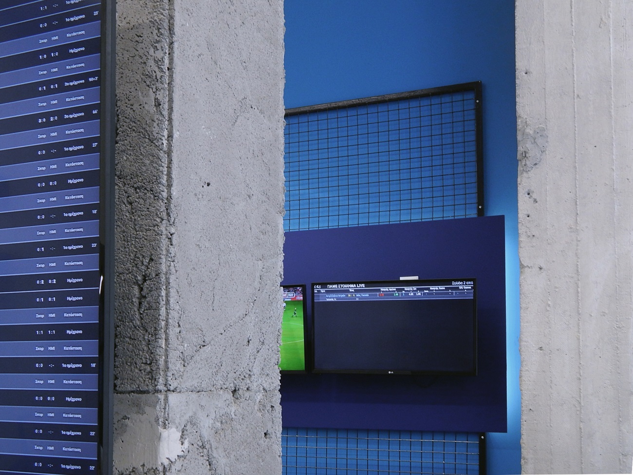 → Τα «αποδυτήρια» όπου οι επισκέπτες μπορούν να μείνουν πιο άνετα στο χώρο, να πάρουν ένα καφέ, αναψυκτικό ή σνακ και να παρακολουθήσουν virtual αγώνες ή ότι άλλο. Τα αποδυτήρια κατασκευάστηκαν από μελαμίνη και συνδυάστηκαν με μεταλλικό πλέγμα το οποίο διαθέτει κρυφό φωτισμό. Η πλάτη τους σε χρώμα πράσινο αντλείται από το χρωματολόγιο του ΟΠΑΠ.