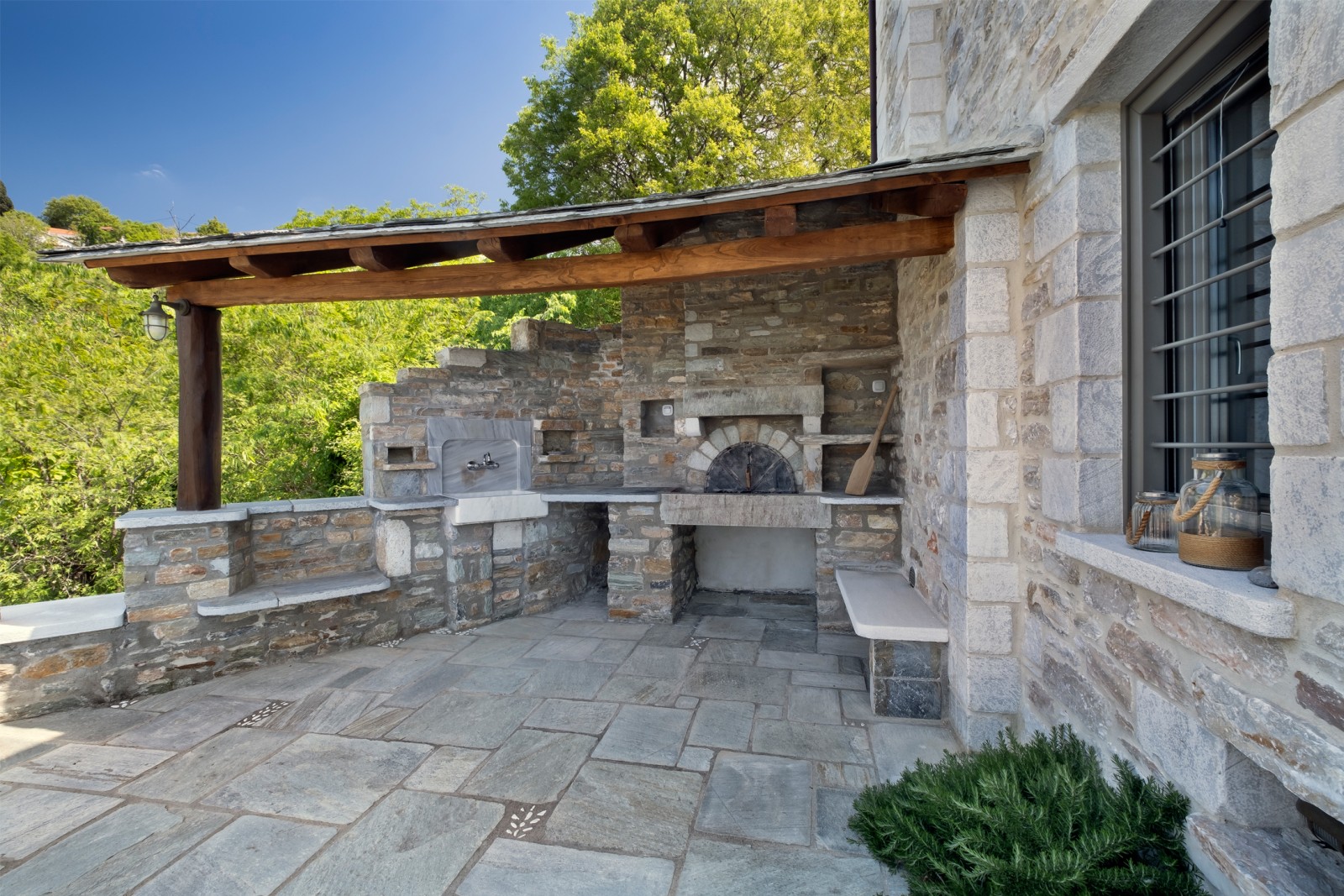The space of the outdoor covered, traditional stone oven is a corner of enjoyment, visual, taste and acoustics as the nightingales that live in the stream next to the courtyard are always willing to accompany the user with their song.