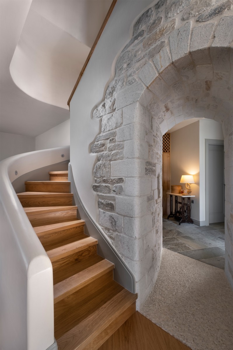 The stone dome that is created at the base of the stairs separates the auxiliary spaces as well as the hostel from the rest of the house. The separation is also aesthetically understood by the materiality that gradually changes leading internally from the main entrance to the hostel.