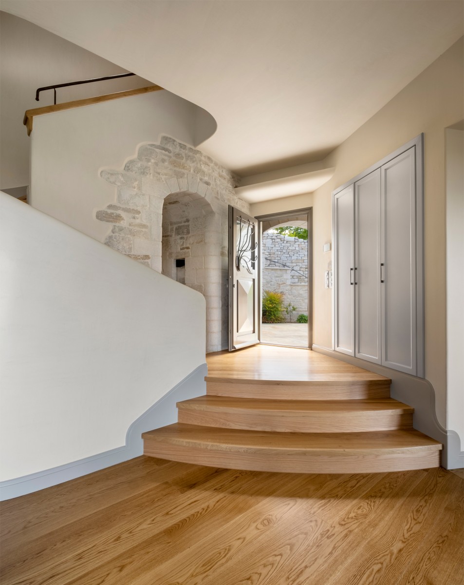 Walking on the cobbles path of the village, we are welcomed by the new residence. A simple wooden door leads to the east garden where the main entrance of the house is located as well as the independent entrance to the guest house with the stone arcade.