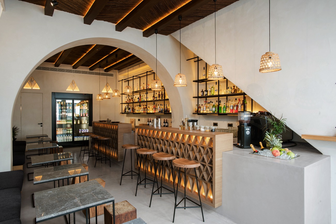 More specifically, the bar consists of a rectangular counter covered with cement mortar in the same color as the floor, becoming in this way its continuation, and two wooden clostrats with triangular patterns that come and “snap” over the facade of the counter.