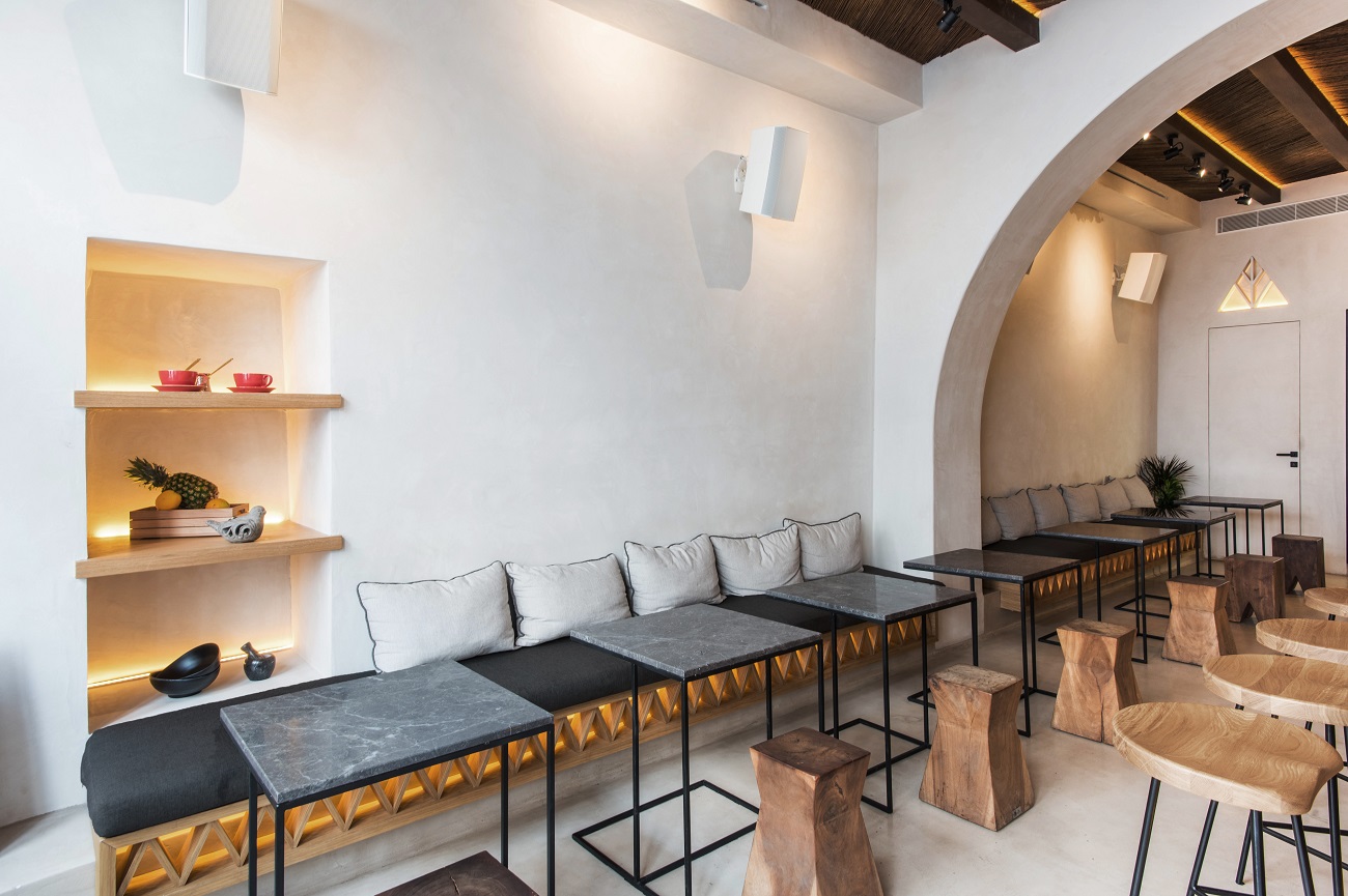 Για αυτό το λόγο διαμορφώθηκε η χαρακτηριστική καμάρα στη μέση περίπου του χώρου χωρίς όμως να δημιουργεί αυστηρά όρια και να εμποδίζει το φως να εισέλθει σε αυτόν. Οι αδρές επιφάνειες των τοίχων και του πατώματος σε γκρι-μπεζ αποχρώσεις τσιμεντοκονίας, τα κρεμαστά φωτιστικά από φυσική ψάθα και η οροφή από από φυσική λυγαριά δημιουργούν μία ζεστή και οικία ατμόσφαιρα.