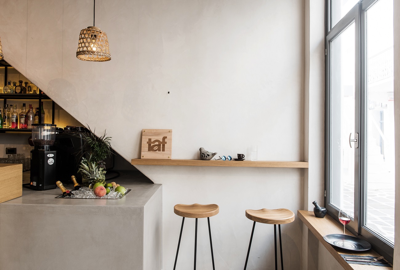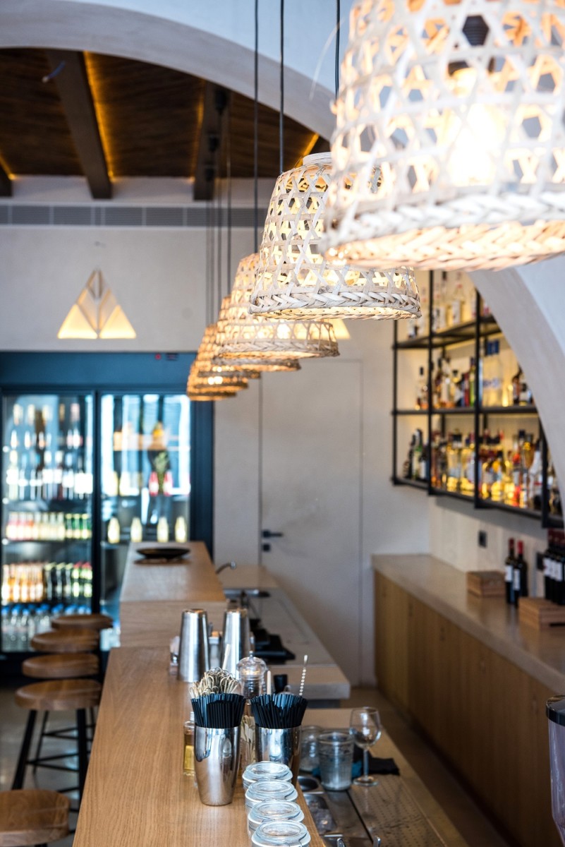 The aim of the design was the expression of the purity of lines and of the traditional Aegean Sea architecture through a minimalist approach. For this reason, in the middle of the space we created the characteristic Cycladic arc, without, however, forming strict boundaries and preventing the light from entering. The rough wall and floor surfacesin gray–beige cement mortar, the hanging lightings made of straw and the roof made of wicker create a warm and intimate atmosphere.