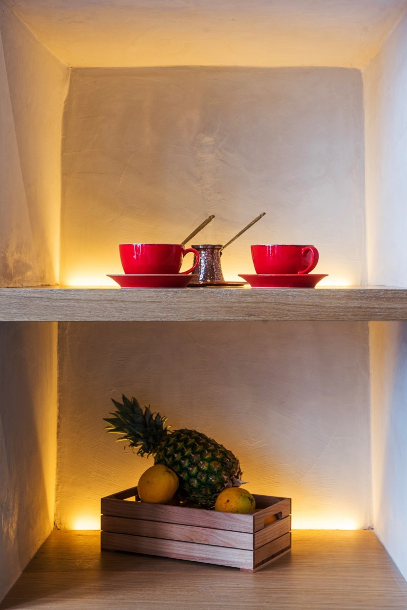 However, the most prominent elements are the triangular patterns of the traditional Cycladicdovecots, used both in the furniture of the bar, the living room, and the WC but as well in the lit cavities in the wall that separates the kitchen from the main area.