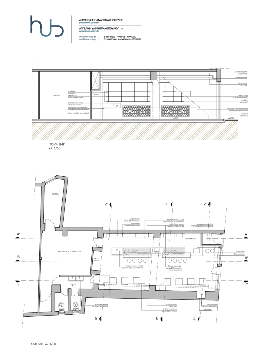 Με την ίδια λογική έχουν κατασκευαστεί και οι ξύλινοι πάγκοι του καθιστικού που διατρέχουν σχεδόν όλο το μήκος του μαγαζιού. Η κάβα πίσω από το μπαρ και τα custom made τραπεζάκια, σχεδιασμένα σε αυστηρά μοντέρνες γραμμές και χρησιμοποιώντας μαύρο μεταλλικό σκελετό και γκρι μάρμαρο, προσδίδουν στο χώρο ένα σύγχρονο διακοσμητικό χαρακτήρα.