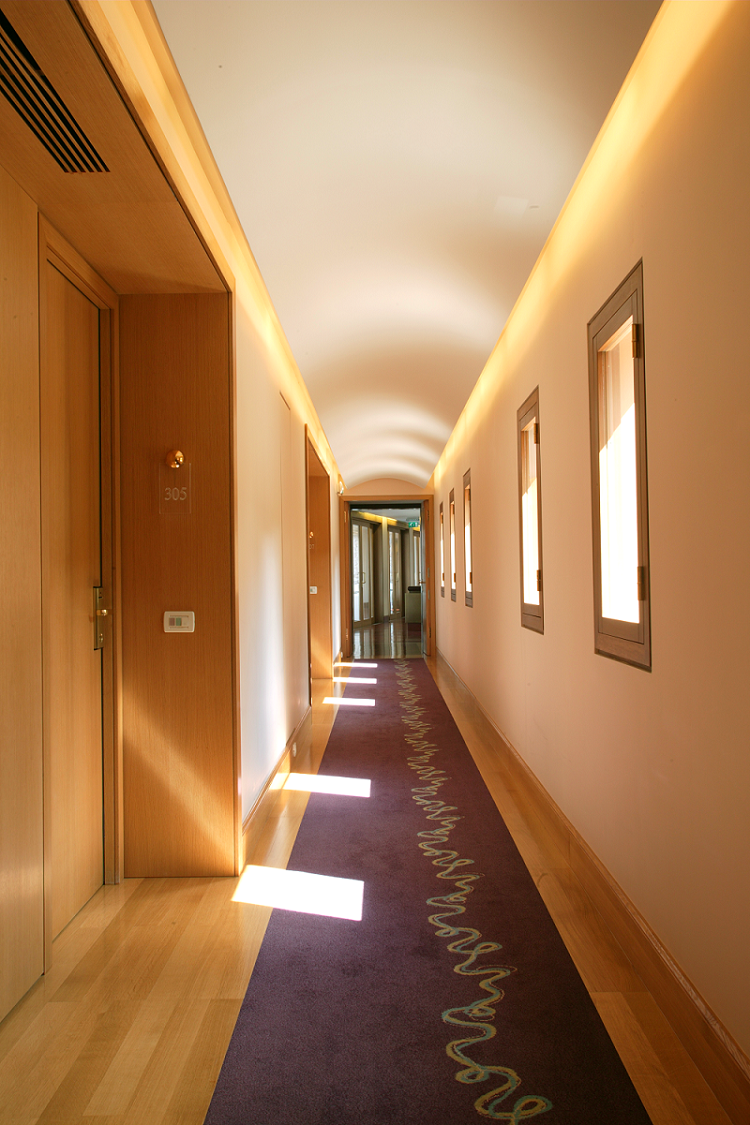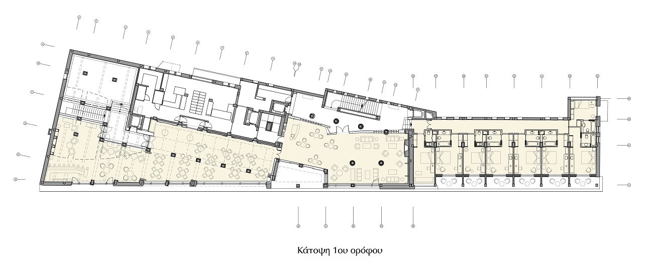 → Στον 1ο όροφο προβλέπονται στην ανατολική πτέρυγα οι χώροι εστίασης – bar, εστιατόριο – και το σαλόνι του ξενοδοχείου, και στη δυτική πτέρυγα τα δωμάτια. Κάθε κοινόχρηστος χώρος έχει τον δικό του χαρακτήρα και τη δική του εσωτερική διακόσμηση. Ενοποιητικό στοιχείο τα υλικά (ξυλεία μαόνι στο δάπεδο και στις επενδύσεις τοίχων, μάρμαρο και μέταλλο σε επιλεγμένα σημεία).