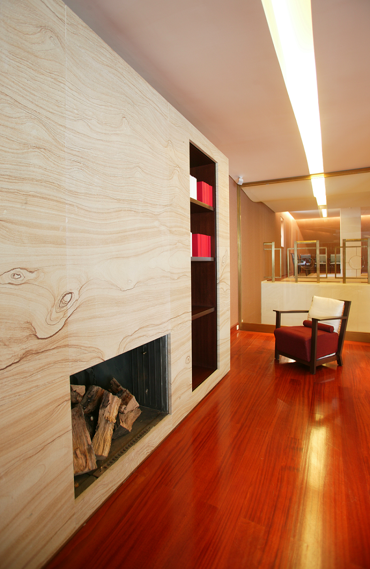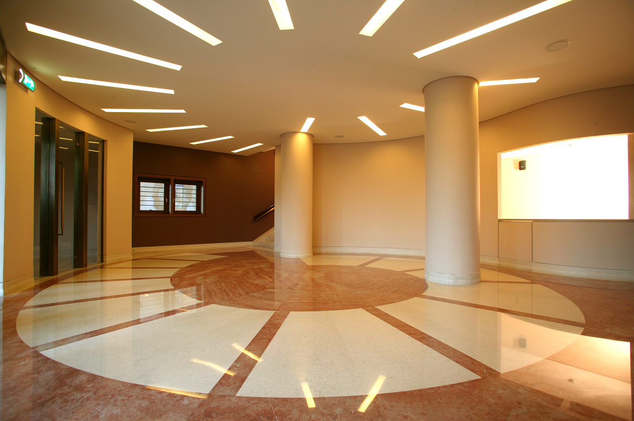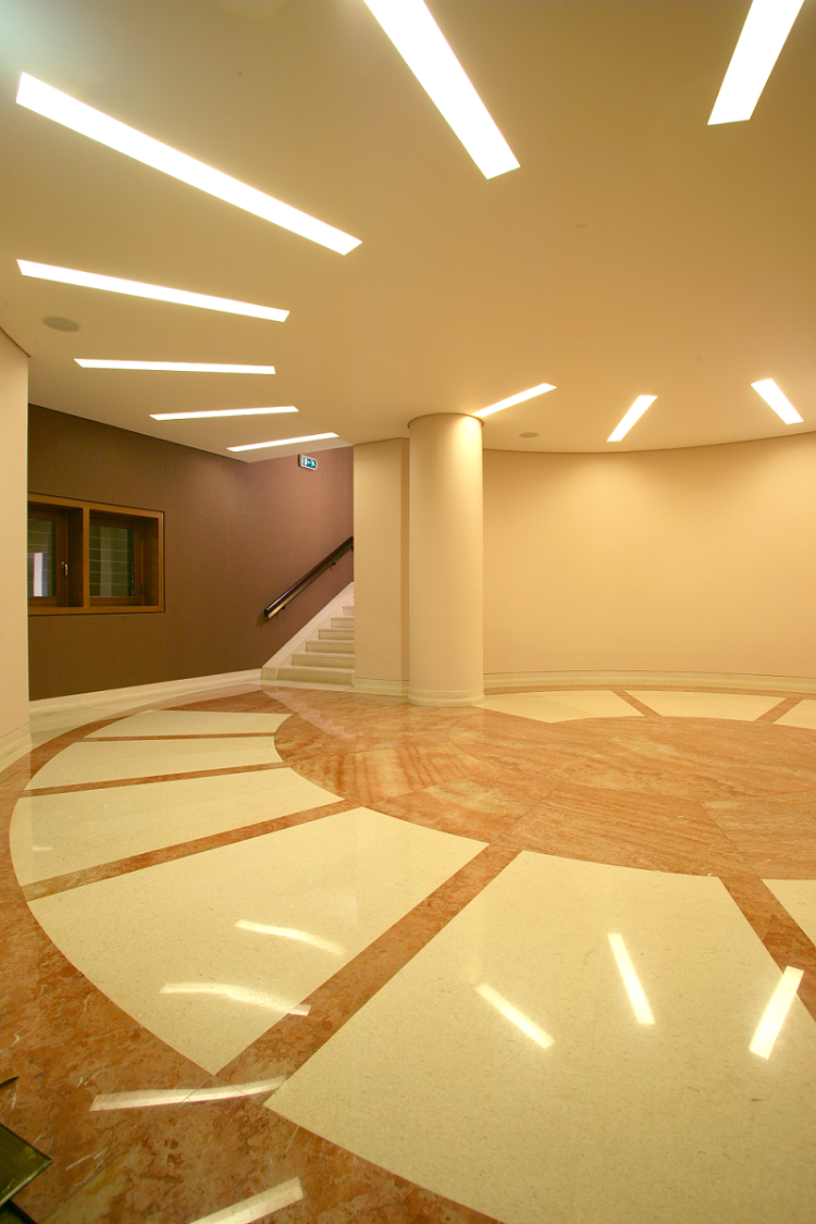 → Τα προβλεπόμενα υλικά στον ισόγειο χώρο είναι μάρμαρα μεγάλων διαστάσεων, με ένθετη διακοσμητική ψηφίδα, μπρούντζινες στραντζαριστές επενδύσεις, ξυλεία μαόνι στις επενδύσεις, ειδικά χειροποίητα διακοσμητικά κρύσταλλα κλπ.