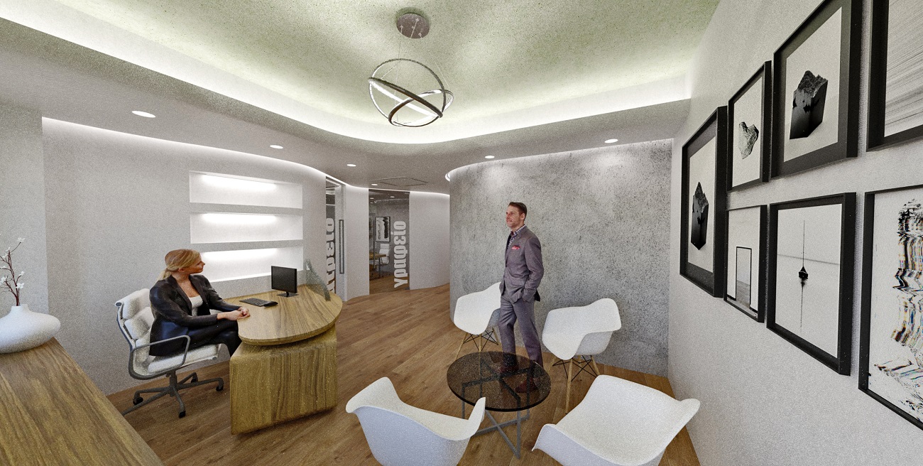 Ένας λευκός «κυματοειδής» τοίχος διαχωρίζει τους κοινόχρηστους χώρους της κλινικής (υποδοχή – αίθουσα αναμονής) από το εξεταστήριο και το γραφείο του ιατρού.