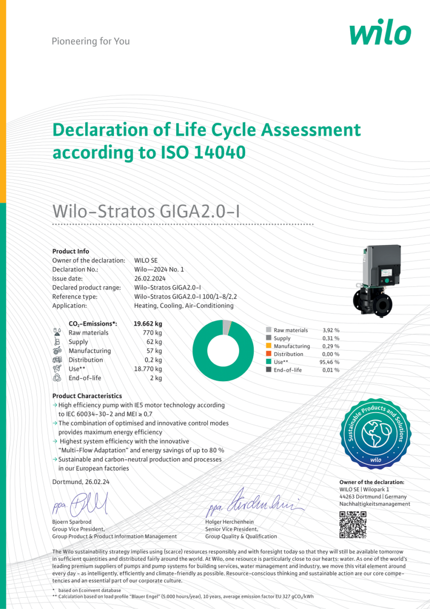 Η εξοικονόμηση ενέργειας στη λειτουργία είναι μόνο ένα κομμάτι της βιωσιμότητας. Η Wilo αξιολογεί ολόκληρο τον κύκλο ζωής των προϊόντων της (Life Cycle Assessment – LCA), από την παραγωγή και τη μεταφορά μέχρι τη λειτουργία, τη συντήρηση και την ανακύκλωση.