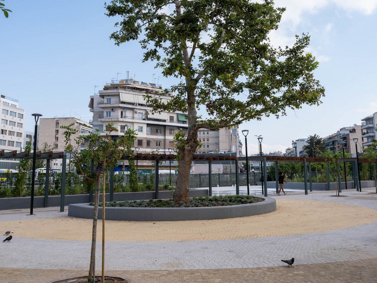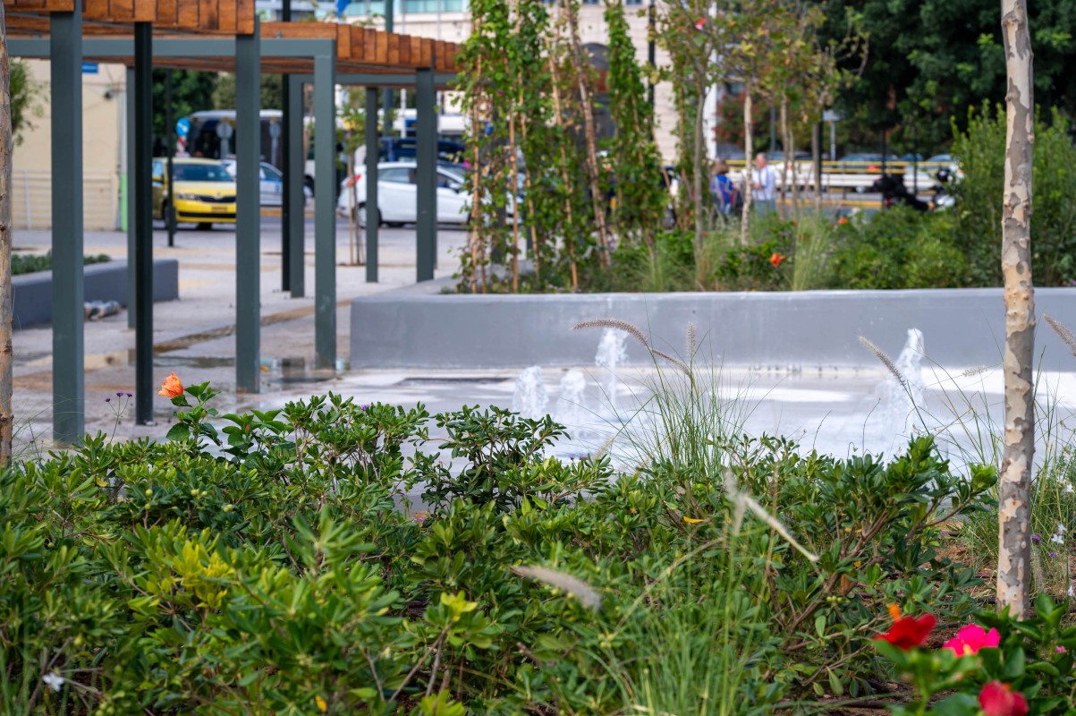 Δημιουργήθηκε, επίσης, ένα νέο σιντριβάνι με επιδαπέδιους πίδακες, έτσι ώστε το νερό να γίνει στοιχείο παιχνιδιού και να προσελκύσει όλες τις ηλικίες, εντάσσοντας μια δραστηριότητα η οποία θα συμβάλλει στην αντιμετώπιση της κλιματικής αλλαγής. Οι παρεμβάσεις αυτές δημιουργούν ένα ευχάριστο, φιλικό και πιο δροσερό περιβάλλον για τους επισκέπτες, ενώ πετυχαίνουν και τη χαμηλή κατακράτηση ποσοτήτων θερμότητας.