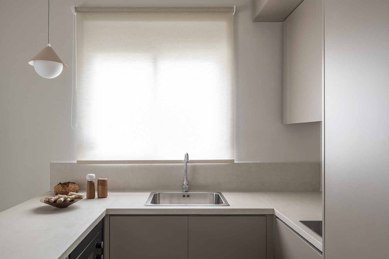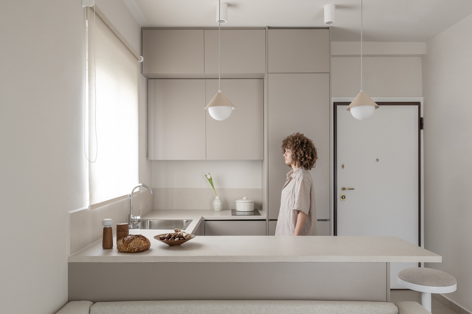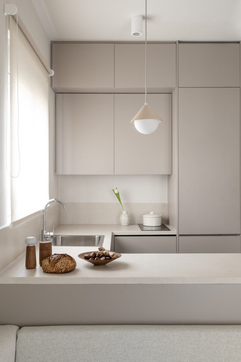 Project title: Casa bēju, Typology: Apartment renovation, Location: Holargos – Athens – Greece, Architectural design: Space is around us, Lead architect: Elli Athanasiadou, Construction: Konstantinos Tsouroulas, Set styling: Elli Athanasiadou, Styling props: Myran, Handmade Ceramics: So ceramic, Model: Dora Psarrou, Loose furniture: Kave Home – Zara Home, Plant pots: Ecopots, Curtains: Sarlas Contract, Bakery: Kora bakery, Area: 43sqm, Year of completion: 2025, Text description: Space is around us, Photography: Vasso Paraschi