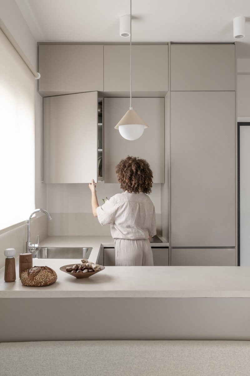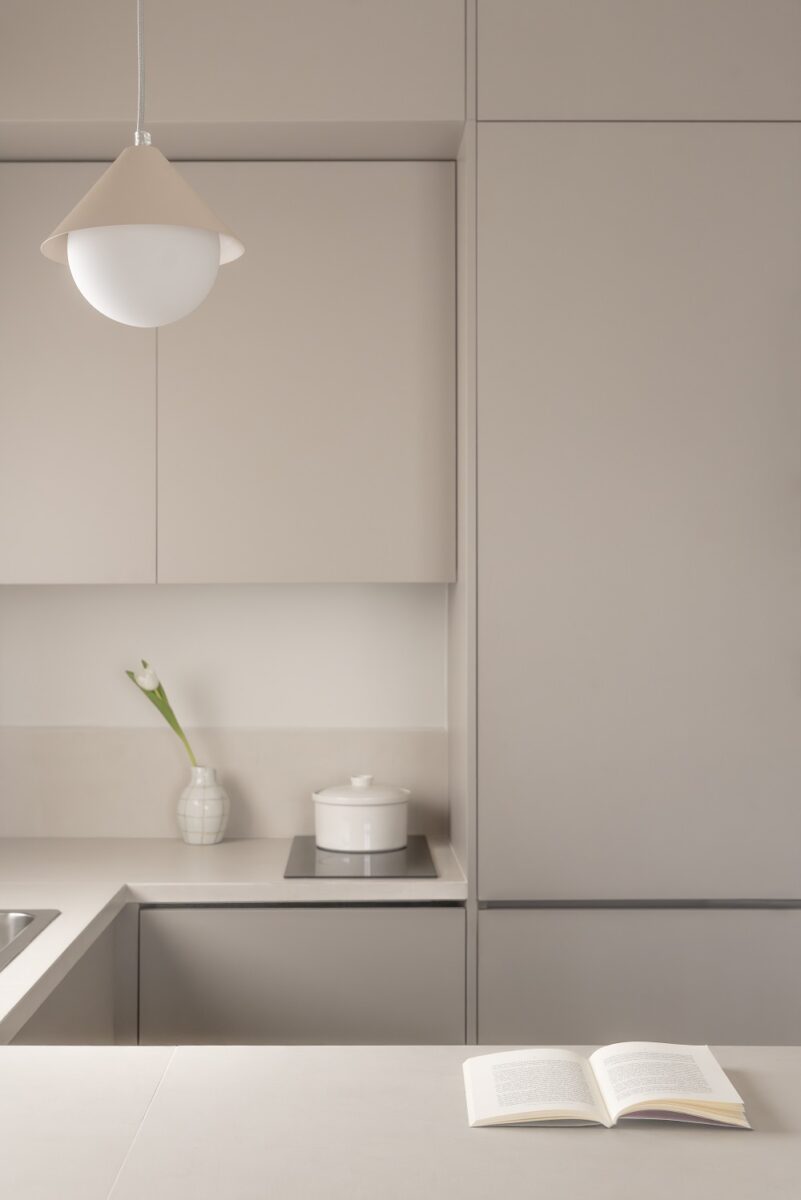 Κάποια από τα κεραμικά διακοσμητικά είναι χειροποίητα και έχουν δημιουργηθεί αποκλειστικά για το έργο από την κεραμίστρια Σοφία Νικολαϊδου και το brand της so ceramic στο πλαίσιο της νέας πρωτοβουλίας του γραφείου Space is around us, να αγκαλιάζει νέους καλλιτέχνες και να παντρεύει αρχιτεκτονική με τέχνη, εξατομικευμένη για το εκάστοτε έργο. Τα ντουλάπια της κουζίνας αναπτύσσονται μέχρι και την οροφή ώστε να εκμεταλλεύονται στο μέγιστο τον καθ ύψος χώρο εφόσον το εμβαδόν του διαμερίσματος είναι περιορισμένο.