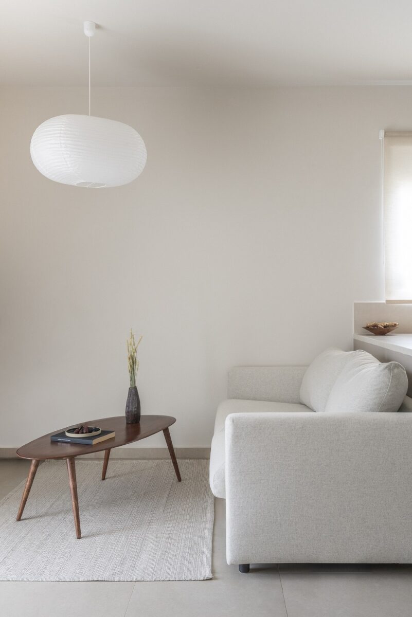 “Τόνοι του μπεζ και του ξύλου συνθέτουν την ταυτότητα του διαμερίσματος σε επίπεδο υλικότητας. Λινές κουρτίνες, ένα βελούδινο κεφαλάρι, μπεζ κεραμικά πλακίδια και κεραμικά διακοσμητικά υπακούν όλα στην μονοτονική παλέτα της γαλήνης: μπεζ, λευκό και καφέ”.