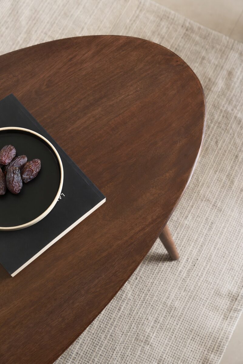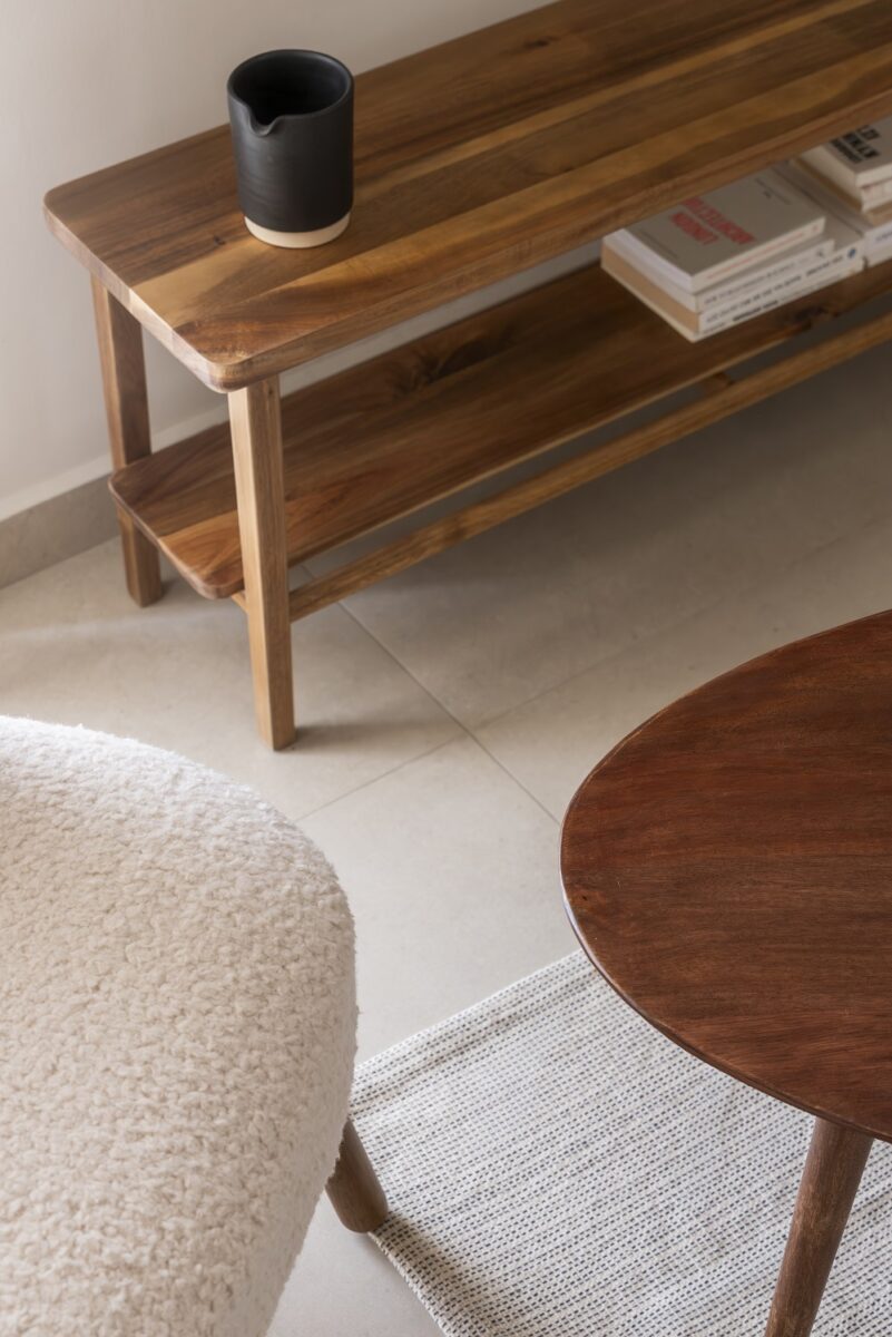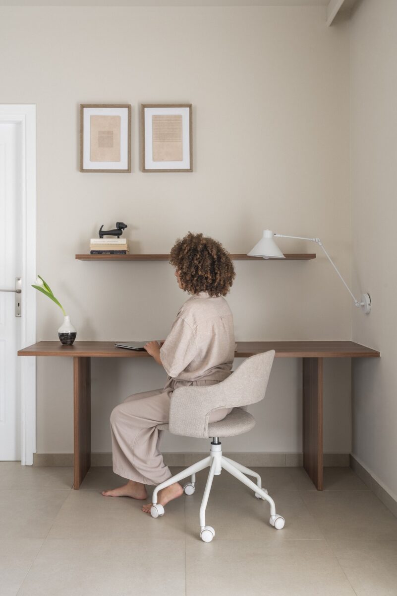 Για τον πάγκο της κουζίνας, προτάθηκε μπεζ κεραμικό πλακίδιο μειώνοντας τον οπτικό θόρυβο και δίνοντας στο χώρο της κουζίνας και της τραπεζαρίας την αίσθηση ενός ενιαίου συνόλου. Στο καθιστικό προστίθενται ζεστές λεπτομέρειες σε ξύλο καρυδιάς και μελιάς με το coffee table και την κονσόλα τηλεόρασης. Το ίδιο υλικό επιλέχθηκε και για το custom σταθερό τραπέζι εργασίας για να ενταχθεί ομαλά στο υπόλοιπο χωρικό σύνολο, αναδεικνύοντας το concept του home–office σε ένα λειτουργικά και αισθητικά κομψό μοντέλο σχεδιασμού.