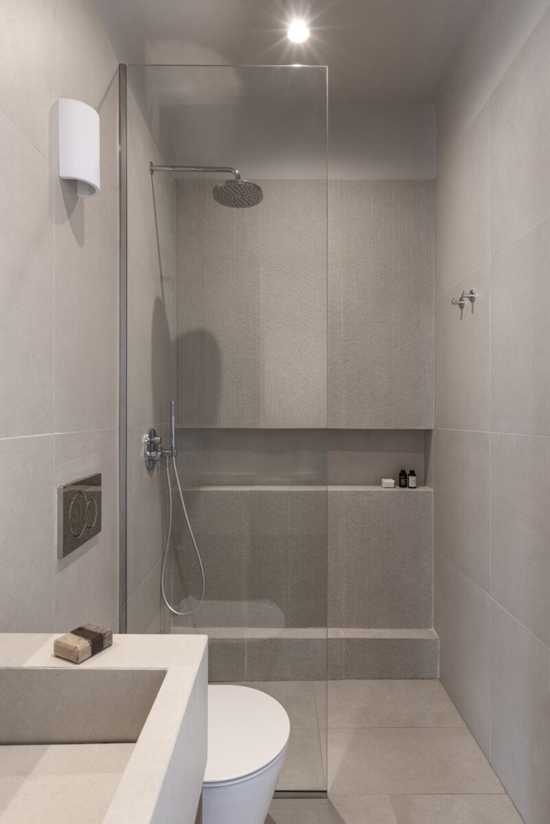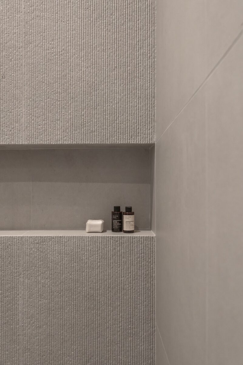 “Ο τοίχος της ντουζιέρας επενδύεται με κεραμικό πλακίδιο ανάγλυφης υφής, εντάσσοντας με αυτόν τον τρόπο και τη δυναμική της απτικότητας και των υφών στο έργο. Πέρα από τη χρωματική συνέπεια η αρχιτεκτονική ομάδα θεώρησε πως η απτική ποικιλία θα δώσει ένα επιπλέον επίπεδο ενδιαφέροντος και ποιοτήτων στο ανακαινισμένο διαμέρισμα”.