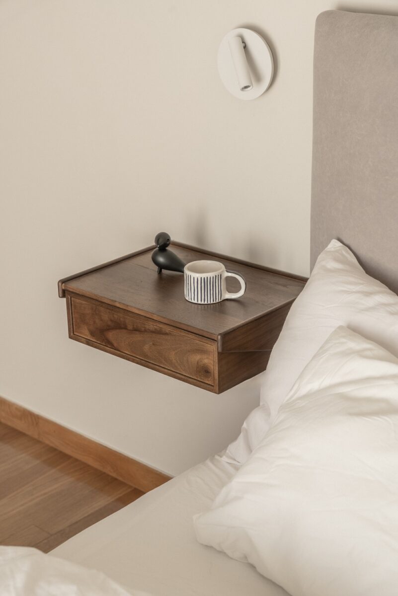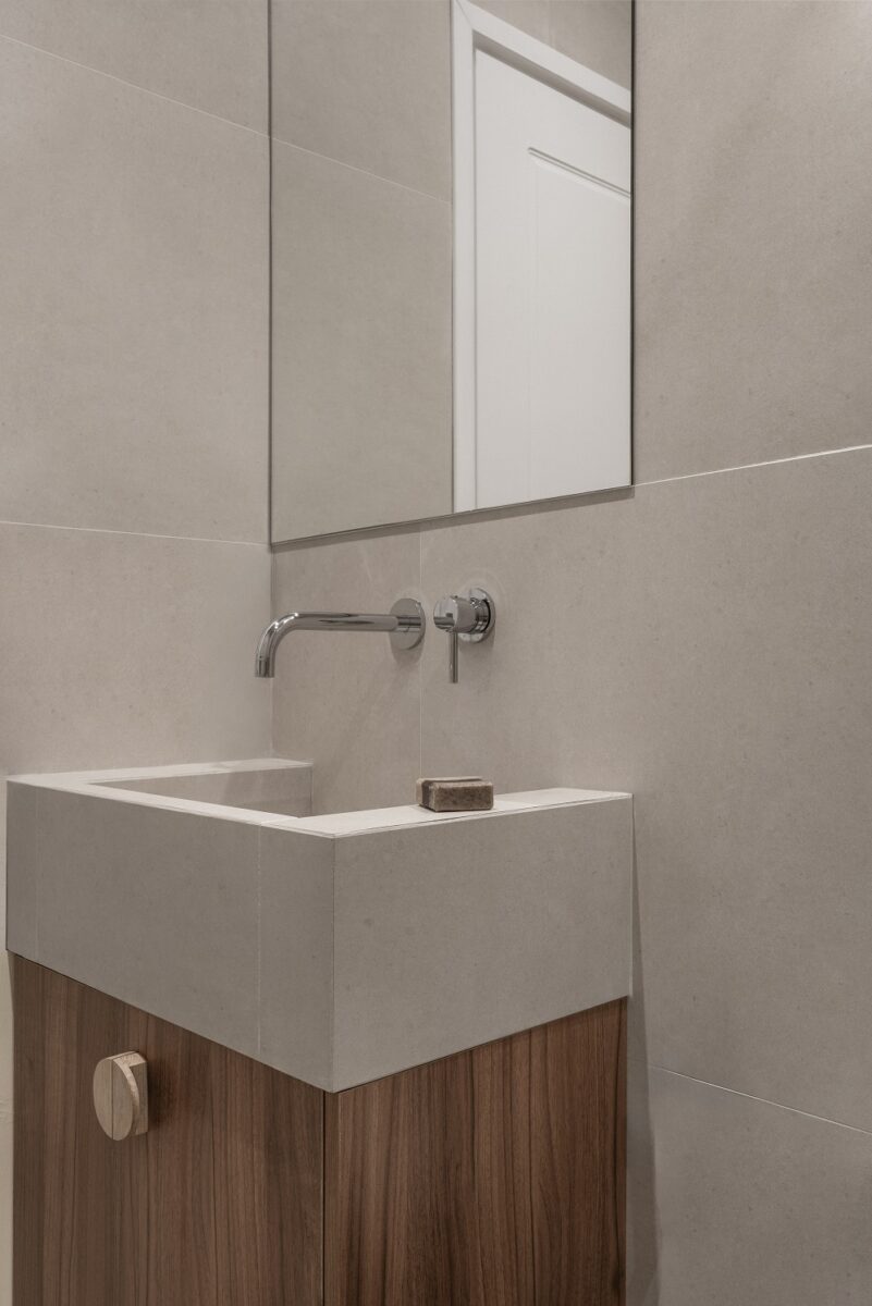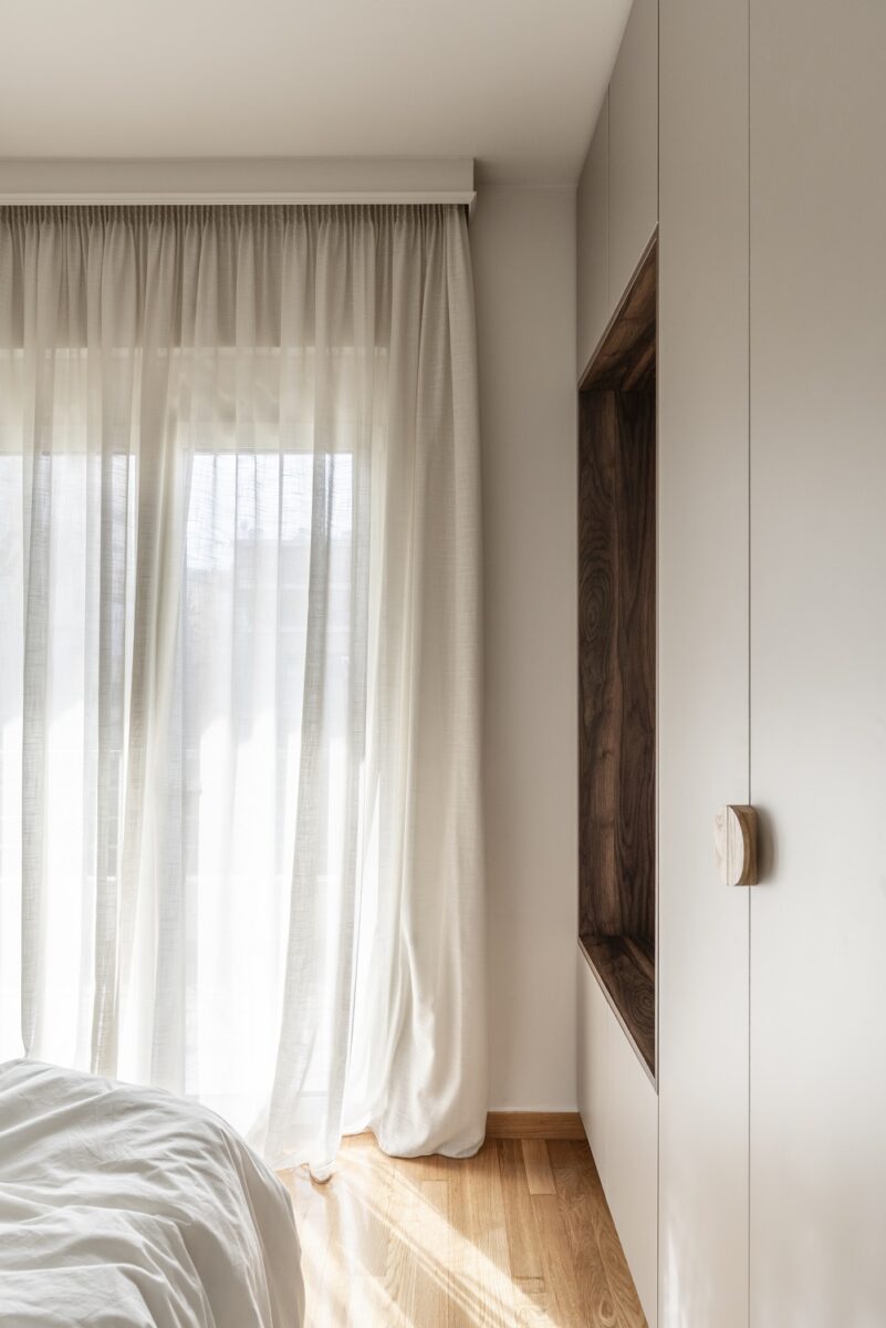 “The bathroom was reconfigured to accommodate a comfortable shower, while in the bedroom, a previously awkward wardrobe was redesigned with an integrated niche. This new element functions as a seat, luggage spot, and everyday hanging area, transforming the wardrobe into a versatile, multi-use feature”.