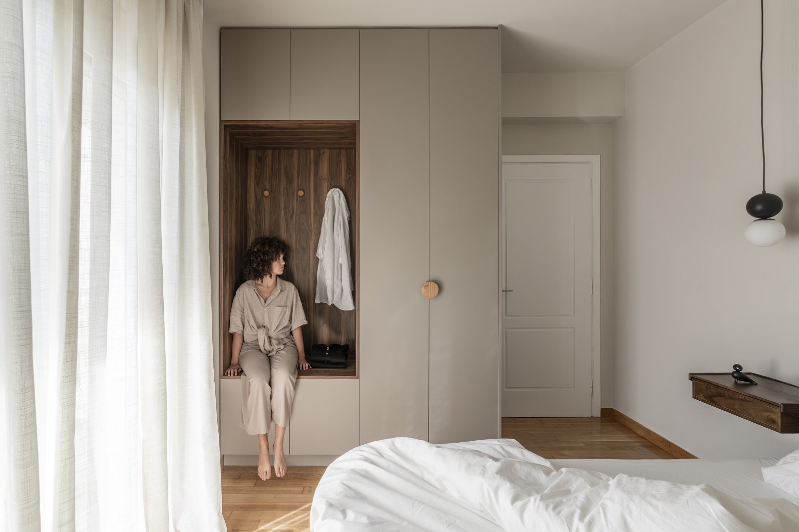 Στο υπνοδωμάτιο, η μέχρι πρότινος δυσλειτουργική ντουλάπα με μια μικρή προεξοχή λόγω της ύπαρξης υποστυλώματος στο πίσω μέρος, αντικαταστάθηκε από μια ντουλάπα με ενσωματωμένη εσοχή που μπορεί πλέον να λειτουργήσει ως κάθισμα, χώρο προσωρινής αποθήκευσης βαλίτσας και κρέμασμα ρούχων καθημερινής χρήσης. Η ντουλάπα αναδεικνύεται σε ένα πολυλειτουργικό έπιπλο.