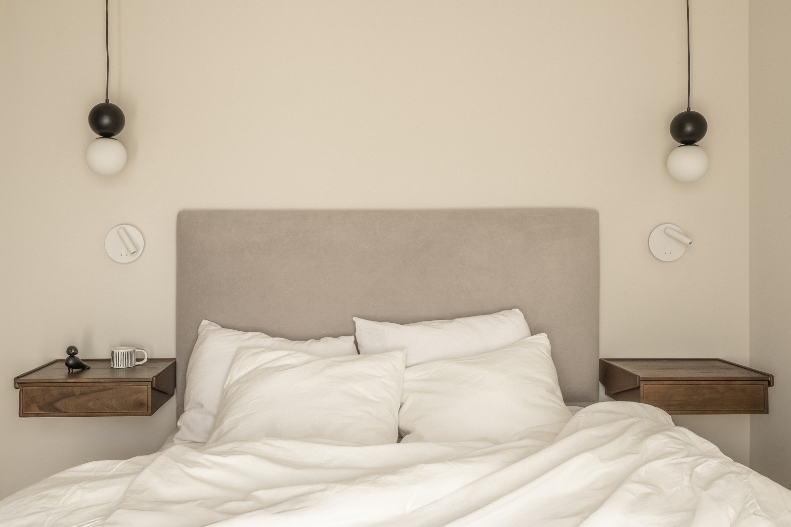 Linen drapery, a velvet headboard, handcrafted ceramics by Sofia Nikolaidou (so ceramic), and beige tile surfaces compose a cohesive palette of natural warmth. This collaboration is part of Space’s new initiative to support emerging artists and integrate bespoke art into architectural work.