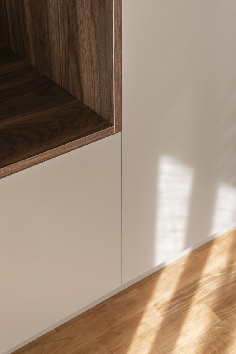 “To maximize storage, the kitchen cabinetry reaches the ceiling, while a beige ceramic countertop visually unifies the kitchen with the dining area. In the living room, walnut and honey-toned woods add subtle warmth through the coffee table, TV console, and custom built-in workspace, which blends seamlessly into the overall composition”.
