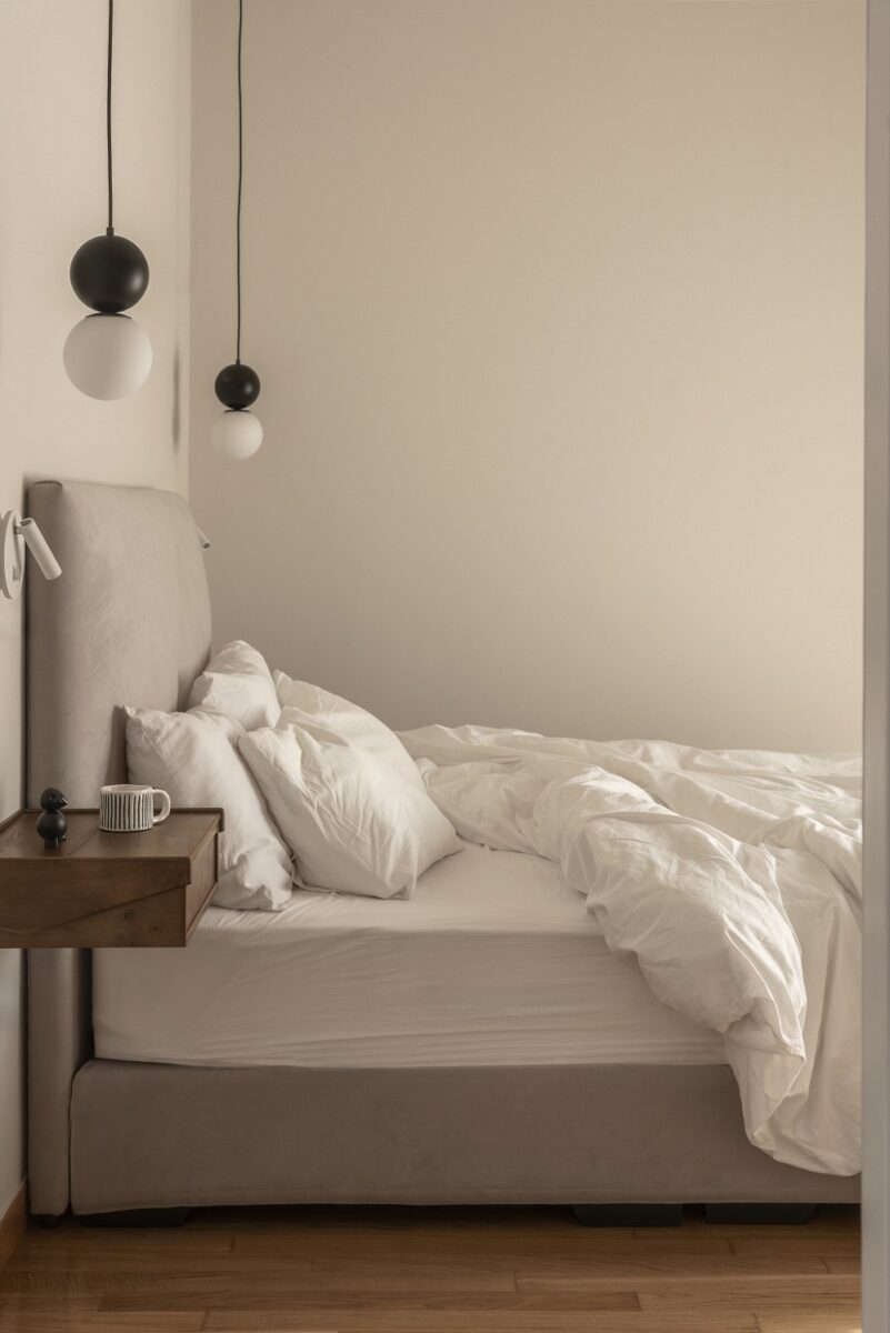 English description: In Holargos, Athens, Space is around us team were commissioned to transform a compact 43sqm apartment in a 2004 building into a serene, contemporary home. With no architectural elements worth retaining, the project became a full redesign centered around the concept of affordable luxury, as envisioned by the owner.