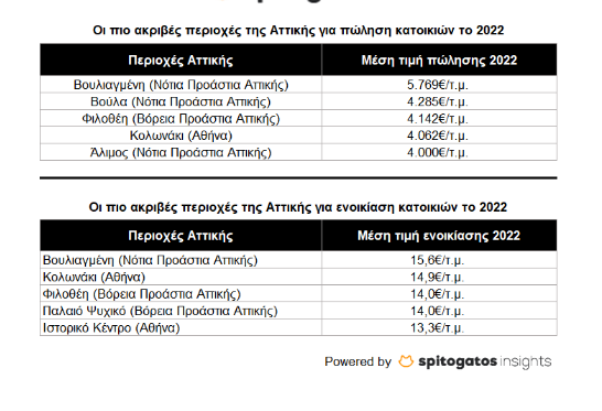 Το 2022 σε όλη την επικράτεια, η αύξηση σε μέσες ζητούμενες τιμές ενοικίασης σε σχέση με το 2021 κυμάνθηκε στο +6,7%, με τις υψηλότερες μεταβολές να εντοπίζονται σε Βάρη-Βάρκιζα (+23%), Φιλοθέη (+21%) , Υμηττό (+18%), Κηφισιά (+15%), Πειραϊκή (+14%), Κολωνάκι (+13%), Αγία Παρασκευή (+12%) και Παγκράτι (+11).